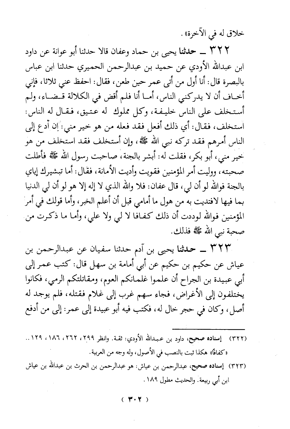 322 - حدثنا يحيى بن حماد وعفان قالا حدثنا أبو عوانة عن داود ابن عبد الله الأودي عن حميد بن عبد الرحمن الحميري حدثنا ابن عباس بالبصرة قال: أنا أول من أتى عمر حين طعن، فقال: احفظ عني ثلاثا، فإني أخاف أن لا يدركني الناس، أما أنا فلم أقض في الكلالة قضاء، ولم أستخلف على الناس خليفة، وكل مملوك له عتيق، فقال له الناس: استخلف، فقال: أي ذلك أفعل فقد فعله من هو خير مني: إن أدع إلى الناس أمرهم فقد تركه نبي الله - صلى الله عليه وسلم -، وإن أستخلف فقد استخلف من هو خير منى، أبو بكر، فقلت له: أبشر بالجنة، صاحبت رسول الله - صلى الله عليه وسلم - فأطلت صحبته، ووليت أمر المؤمنين فقويت وأديت الأمانة، فقال: أما تبشيرك إياي بالجنة فوالله لو أن لي، قال عفان: فلا والله الذي لا إله إلا هو لو أن لي الدنيا بما فيها لافتديت به من هول ما أمامي قبل أن أعلم الخبر، وأما قولك في أمر المؤمنين فوالله لوددت أن ذلك كفافا لا لي ولا علي، وأما ما ذكرت من صحبة نبي الله - صلى الله عليه وسلم - فذلك.