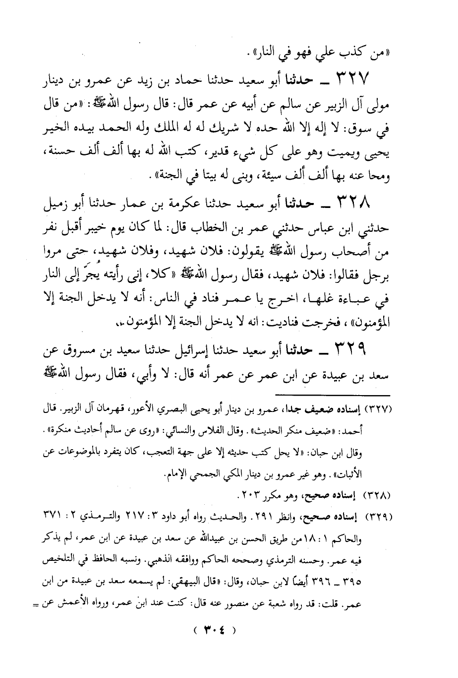 (327) إسناده ضعيف جدا، عمرو بن دينار أبو يحيى البصري الأعور، قهرمان آل الزبير. قال أحمد: "ضعيف منكر الحديث". وقال الفلاس والنسائي: "روى عن سالم أحاديث منكرة".