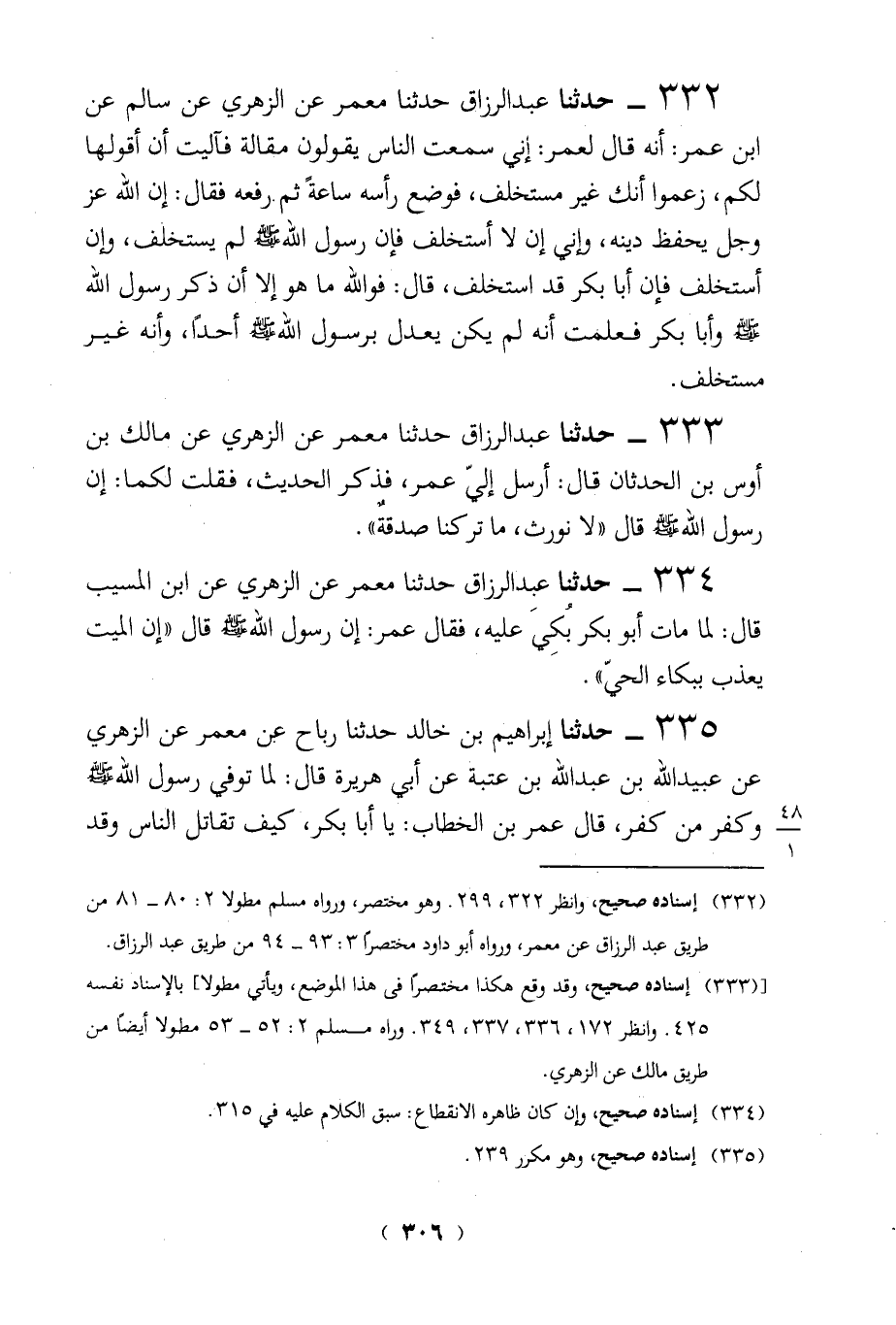 335 - حدثنا إبراهيم بن خالد حدثنا رباح عن معمر عن الزهري عن عبيد الله بن عبد الله بن عتبة عن أبي هريرة قال: لما توفي رسول - صلى الله عليه وسلم - وكفر من كفر، قال عمر بن الخطاب: يا أبا بكر، كيف تقاتل الناس وقد