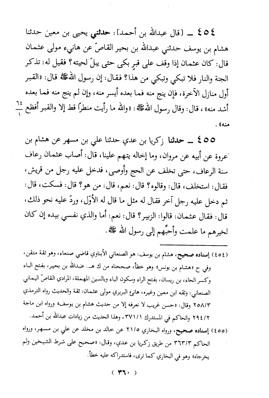 454 - [قال عبد الله بن أحمد]: حدثني يحيى بن معين حدثنا هشام بن يوسف حدثنا عبد الله بن بحير القاصّ عن هانئ مولى عثمان قال: كان عثمان إذا وقف على قبرٍ بكى حتى يبلّ لحيته؟ فقيل له: تذكر
