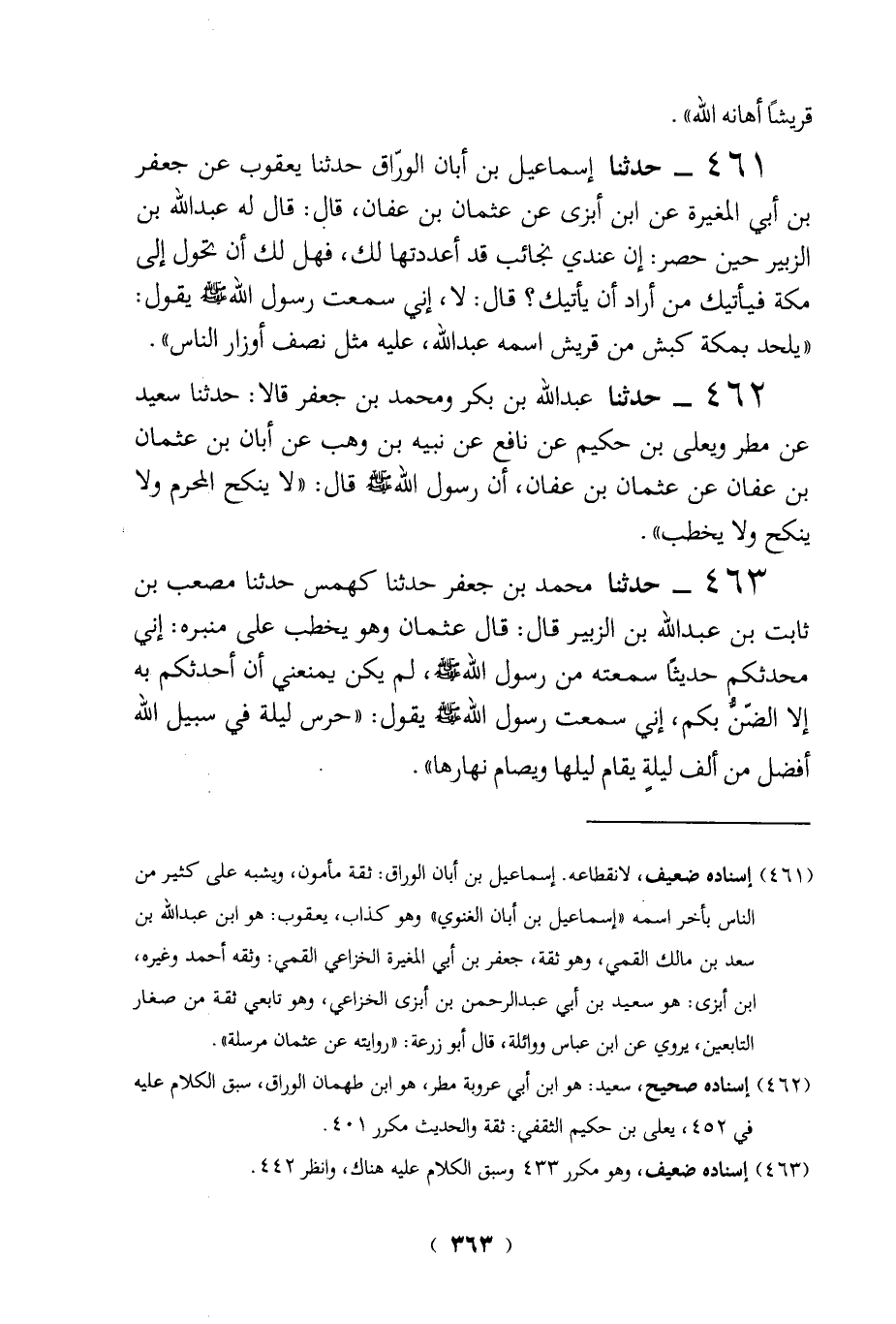 463 - حدثنا محمد بن جعفرحدثنا كهمس حدثنا مصعب بن ثابت بن عبد الله بن الزبير قال: قال عثمان وهو يخطب على منبره: إني محدثكم حديثاً سمعته من رسول الله - صلى الله عليه وسلم -، لم يكن يمنعني أن أحدثكم به إلا الضّنُّ بكم، إني سمعت رسول الله - صلى الله عليه وسلم - يقول: "حرس ليلة في سبيل الله أفضل من ألف ليلةٍ يقام ليلها ويصام نهارها".