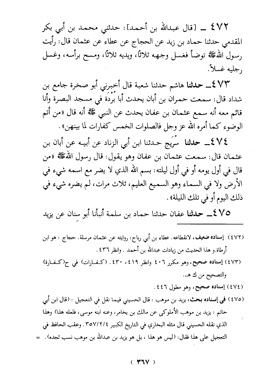 472 - [قال عبد الله بن أحمد]: حدثنا محمد بن أبي بكر المقدمي حدثنا حماد بن زيد عن الحجاج عن عطاء عن عثمان قال: رأيت رسول الله - صلى الله عليه وسلم - توضأ فغسل وجهه ثلاثاً، ويديه ثلاثاً، ومسح برأسه، وغسل رجليه غسلاً.