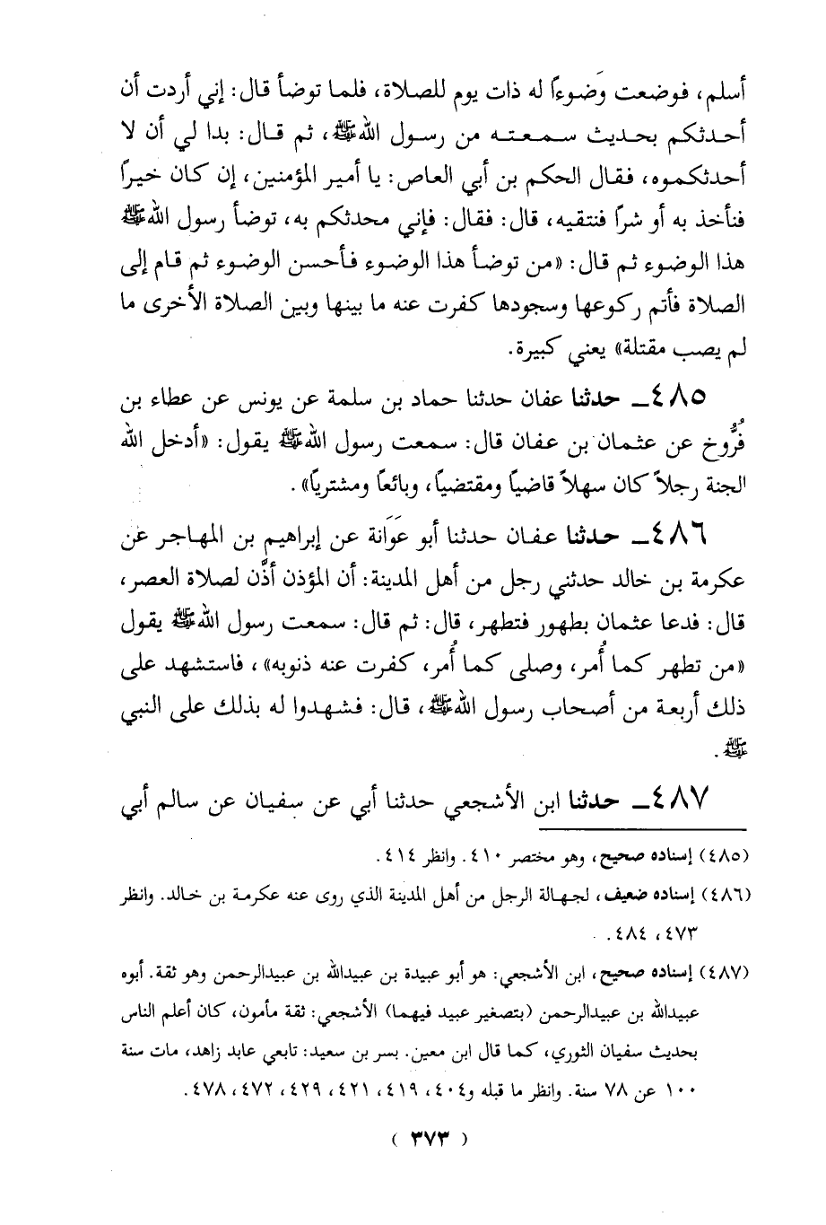 (487) إسناده صحيح، ابن الأشجعي: هو أبو عبيدة بن عبيد الله بن عبيد الرحمن وهو ثقة. أبوه عبيد الله بن عبيد الرحمن "بتصغير عبيد فيهما" الأ شجعى: ثقة مأمون، كان أعلم الناس بحديث سفيان الثوري، كما قال ابن معين. بسر بن سعيد: تابعي عابد زاهد، مات سنة 100 عن 78 سنة. وانظرما قبله و 404، 419، 421، 429، 478،472.