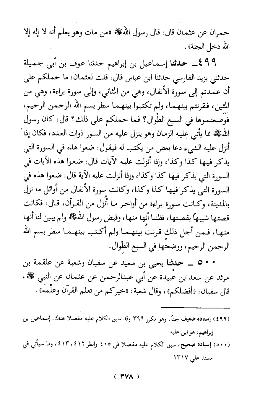 500 - حدثنا يحيى بن سعيد عن سفيان وشعبة عن علقمة بن مرثد عن سعد بن عُبيدة عن أبي عبد الرحمن عن عثمان عن النبي - صلى الله عليه وسلم -، قال سفيان: "أفضلكم"، وقال شعبة: "خيركم من تعلم القرآن وعلَّمَه".