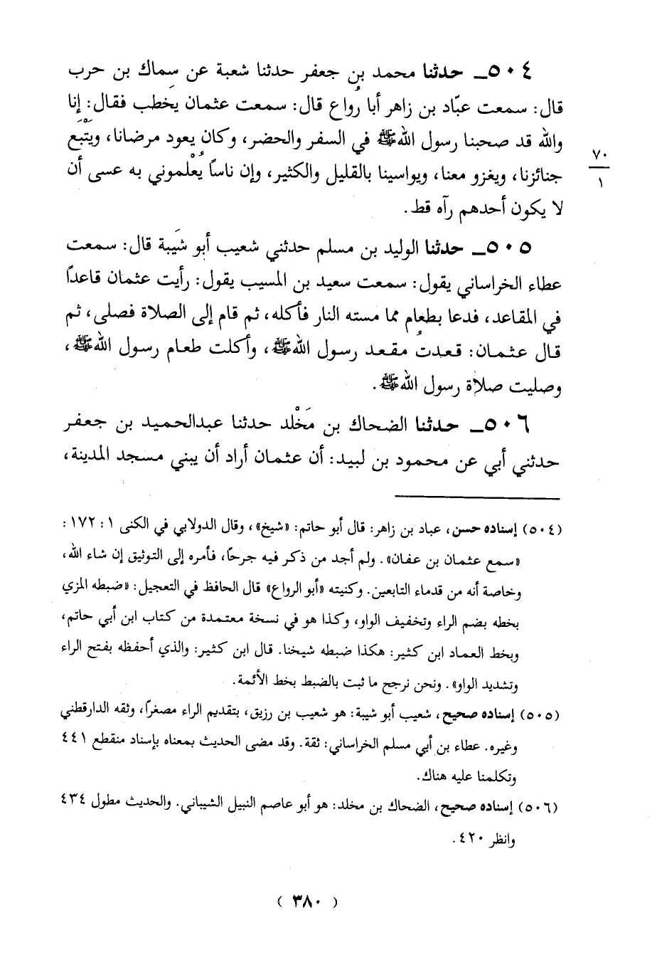 504 - حدثنا محمد بين جعفر حدثنا شعبة عن سماك بن حرب قال: سمعت عبّاد بن زاهر أبا رُواع قال: سمعت عثمان يخَطب فقال: إِنا والله قد صحبنا رسول الله - صلى الله عليه وسلم - في السفر والحضر، وكان يعود مرضانا، ويَتْبَع جنائزنا، ويغزو معنا، ويواسينا بالقليل والكثير، وان ناساً يُعْلموني به عسى أن لا يكون أحدهم رآه قط.