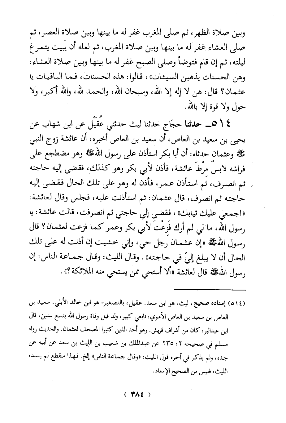 (514) إسناده صحيح، ليث: هو ابن سعد. عقيل، بالتصغير: هو ابن خالد الأيلي. سعيد بن العاص بن سعيد بن العاص الأموي: تابعى كبير، ولد قبل وفاة رسول الله بتسع سنين، قال ابن عبد البر: كان من أشراف قريش. وهو أحد الذين كتبوا المصحف لعثمان. والحديث رواه مسلم في صحيحه 2: 235 عن عبد الملك بن شعيب بن الليث بن سعد عن أبيه عن جده، ولم يذكر في آخره قول الليث:" وقال جماعة الناس" إلخ. فهذا منقطع لم يسنده الليث، فليس من الصحيح الإسناد.