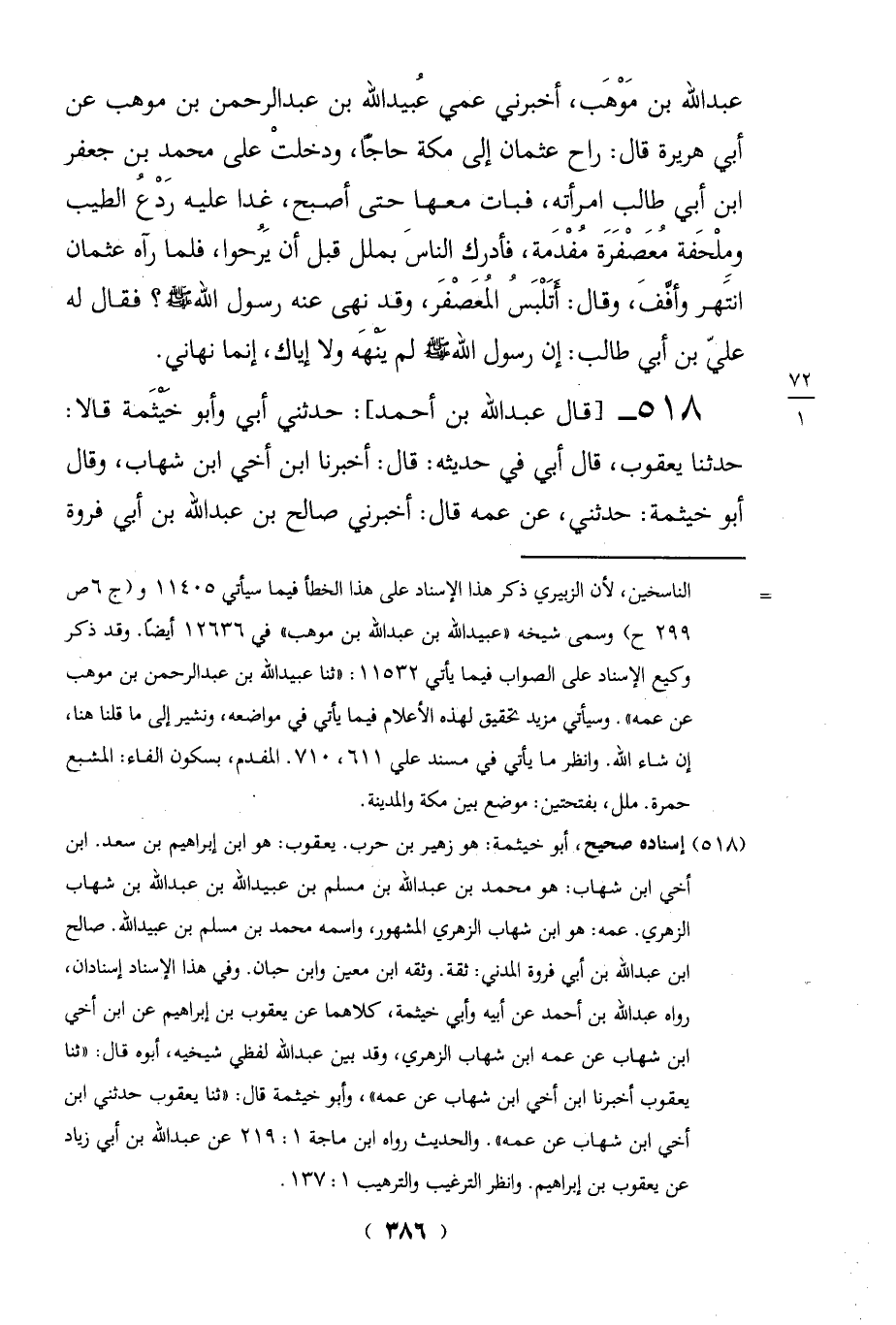518 - [قال عبد الله بن أحمد]: حدثني أبي وأبو خَيْثَمة قالا: حدثنا يعقوب، قال أبي في حديثه: قال: أخبرنا ابن أخي ابن شهاب، وقال أبو خيثمة: حدثنا، عن عمه قال: أخبرني صالح بن عبد الله بن أبي فروة