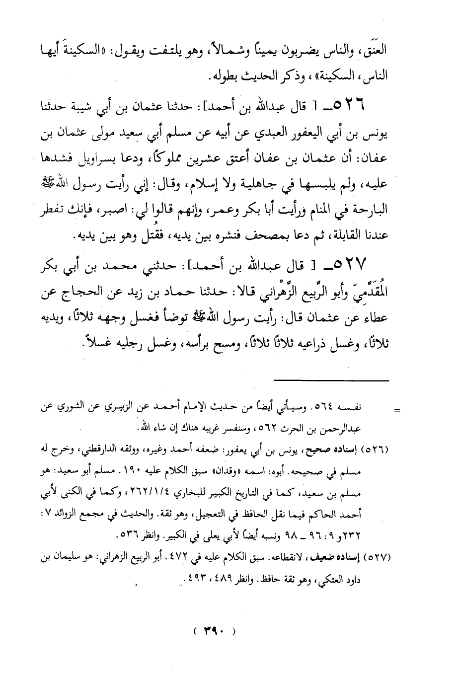 526 - [قال عبد الله بن أحمد]: حدثنا عثمان بن أبي شيبة حدثنا يونس بن أبي اليعفور العبدي عن أبيه عن مسلم أبي سعيد مولى عثمان بن عفان: أن عثمان بن عفان أعتق عشرين مملوكاً، ودعا بسراويل فشدها عليه، ولم يلبسها في جاهلية ولا إسلام، وقال: إني رأيت رسول الله - صلى الله عليه وسلم -! البارحة في المنام ورأيت أبا بكر وعمر، وإنهم قالو! لي: اصبر، فإنك تفطر عندنا القابلة، ثم دعا بمصحف فنشره بين يديه، فقُتل وهو بين يديه.