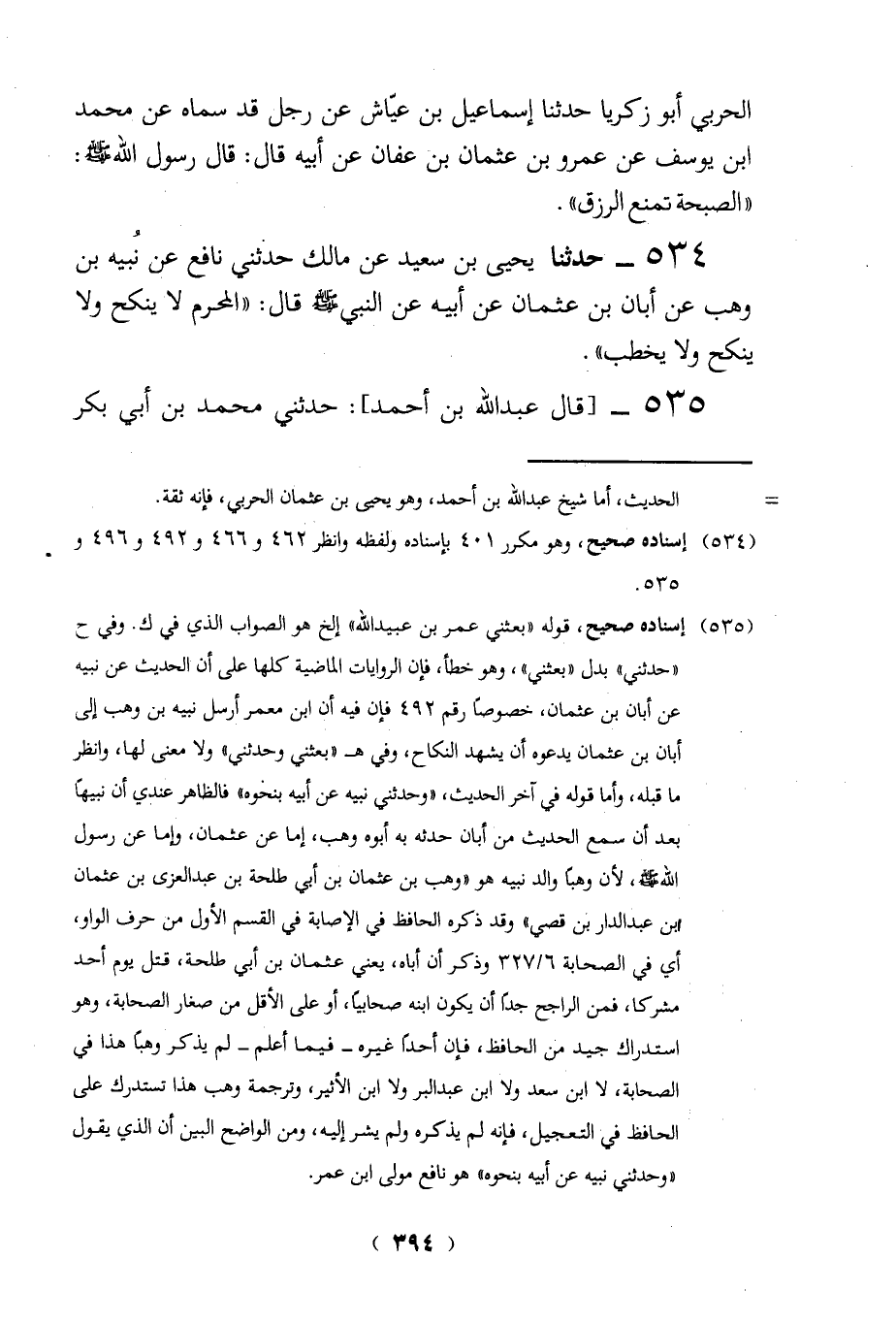 الحربي أبو زكريا حدثنا إسماعيل بن عيّاش عن رجل قد سماه عن محمد ابن يوسف عن عمرو بن عثمان بن عفان عن أبيه قال: قال رسول الله - صلى الله عليه وسلم -: "الصبحة تمنع الرزق".