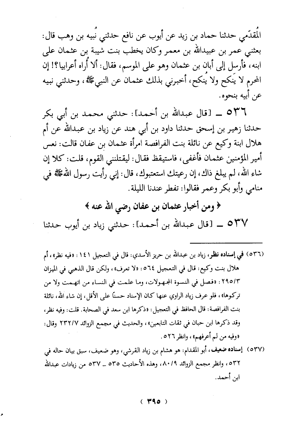 536 - [قال عبد الله بن أحمد]: حدثنى محمد بن أبي بكر حدثنا زهير بن إسحق حدثنا داود بن أبي هند عن زياد بن عبد الله عن أم هلال ابنة وكيع عن نائلة بنت الفرافصة امرأة عثمان ببن عفان قالت: نعس أمير المؤمنين عثمان فأغفى، فاستيقظ فقال: ليقتلنني القوم، قلت: كلا إن شاء الله، لم يبلغ ذاك، إن رعيتك استعتبوك، قال: إني رأيت رسول الله - صلى الله عليه وسلم - في منامي وأبو بكر وعمر فقالوا: تفطر عندنا الليلة.