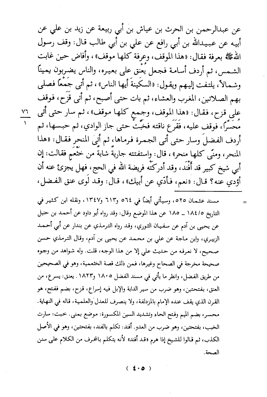 عن عبد الرحمن بن الحرث بن عياش بن أبي ربيعة عن زيد بن علي عن أبيه عن عبيد الله بن أبي رافع عن علي بن أبي طالب قال: وقف رسول الله - صلى الله عليه وسلم - بعرفة فقال: "هذا الموقف، وعرفة كلها موقف"، وأفاض حين غابت الشمس، ثم أردف أسامة فجعل يُعْنق على بعيره، والناس يضربون يميناً وشمالا، يلتفت إليهم ويقول: "السكَينةَ أيها الناس"، ثم أتى جَمْعاً فصلى بهم الصلاتين، المغرب والعشاء، ثم بات حتى أصبح، ثم أتى قَزَح، فوقف علىِ قزح، فقال: "هذا الموقف، وجمع كلها موقف"، ثم سار حتى أتى محُسِّراً، فوقف عليه، فَقَرَع ناقته فخَّبت حتى جاز الوادي، ثم حبسها، ثم أردف الفضلَ وسار حتى أتى الجمرة فرماها، ثم أتى المنحرِ فقال: "هذا المنحر، ومنى كلها منحر"، قال: واستفتته جاريةٌ شابةٌ من خَثْعَمٍ فقالت: إن أبي شيخ كبير قد أَفْنَد، وقد أدركَتْه فريضة الله في الحج، فهل يجزئ عنه أن أؤدي عنه؟ قال: "نعم، فأدَّي عن أبيك"، قال: وقد لَوى عنق الفضل،