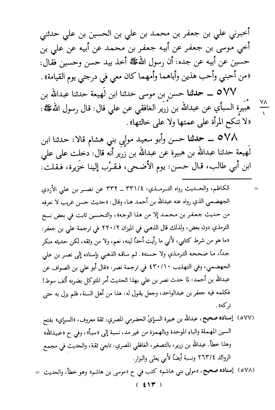 577 - حدثنا حسن بِن موسى حدثنا ابن لَهيعة حدثنا عبد الله بنُ هُبَيرة السبأي عن عبد الله بن زُرَير الغافقي عن علي قال: قال رسول الله - صلى الله عليه وسلم -: "لا تُنكح المرأة على عمتها ولا على خالتها".