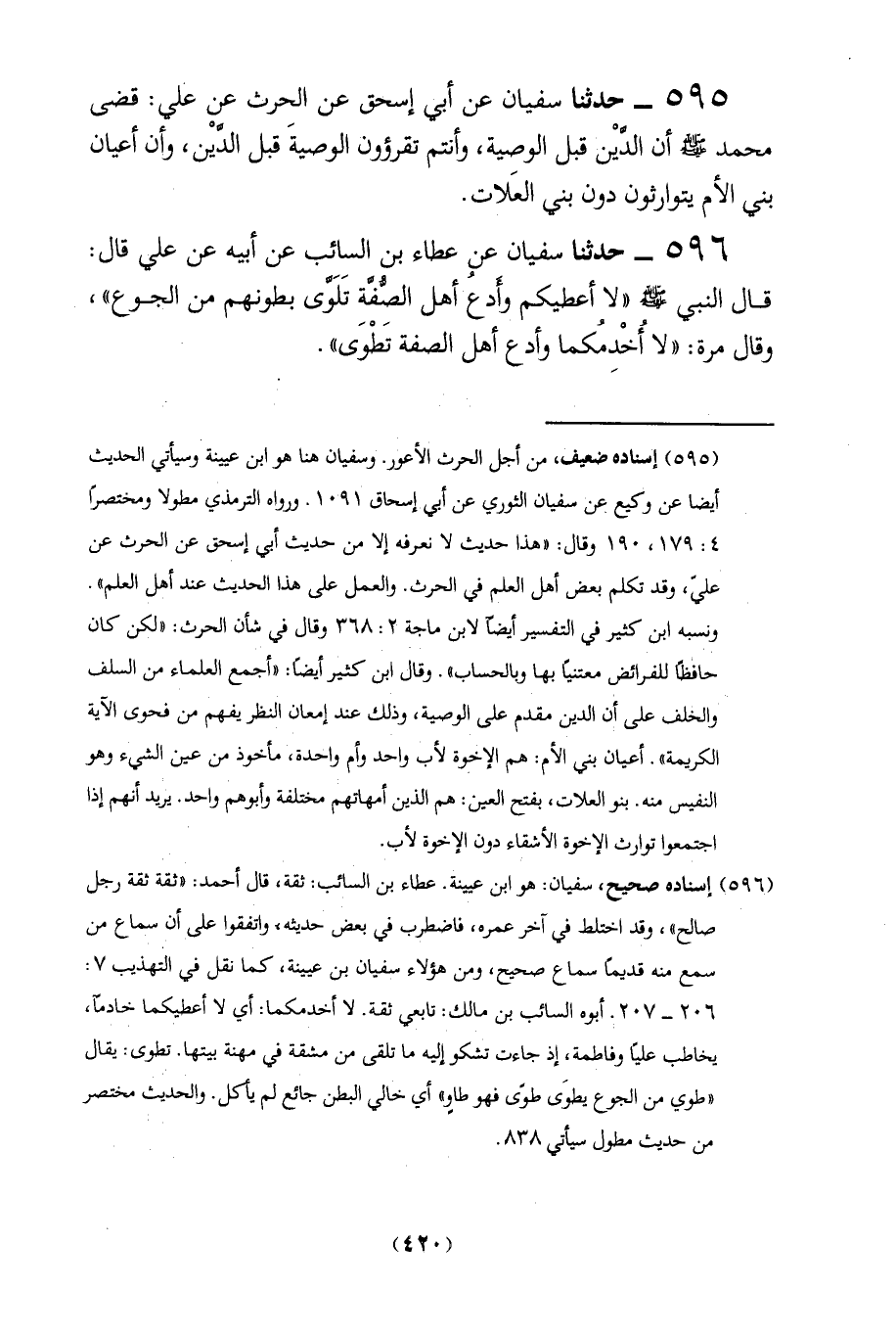 595 - حدثنا سفيان عن أبي إسحق عن الحرث عن علي: قضى محمد - صلى الله عليه وسلم - أن الدَّيْن قبل الوصية، وأنتم تقرؤون الوصيةَ قبل الدَّيْن، وأن أعيان بني الأم يتوارثون دون بني العَلات.