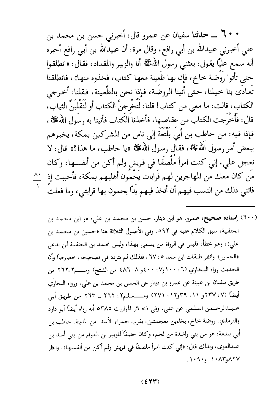 600 - حدثنا سفيان عن عمرو قال: أخبرني حسن بن محمد بن علي أخبرني عبيد الله بن أبي رافع، وقال مرة: أن عبيد الله بن أبي رافع أخبره أنه سمع عليَّا يقول: بعثني رسول الله - صلى الله عليه وسلم - أنا والزبير والمقداد، فقال: "انطلقوا حتىِ تأتوا رَوْضة خاخ، فإن بها ظَعِينة معها كتاب، فخذوه منها"، فانطلقنا تَعادى بنا خيلنا، حتى أتينا الروضة، فإذا نحن بالظَّعينة، فقلنا: أخرجي الكتاب، قالت: ما معي من كتاب! قلنا: لَتُخْرجنَّ الكتاب أو لَنَقْلِبَنَّ الثياب، قال: فَأَخْرَجت الكتاب من عقاصها، فأخذنا الكَتاب فأتينا به رسول الله - صلى الله عليه وسلم -، فإذا فيه: من حاطب بن أبي بَلْتَعَةَ إلى ناس من المشركين بمكة، يخبرهم ببعض أمر رسول الله - صلى الله عليه وسلم -، فقال رسول الله - صلى الله عليه وسلم - "يا حاطب، ما هذا؟ "قال: لا تعِجل علي، إني كنت امرأ مُلْصَقا في قرِيش ولم أكن من أنفسها، وكان من كان معك من المهاجرين لهم قَرابات َيحْمُون أهليهم بمكة، فأحببت إذ فاتني ذلك من النسب فيهم أن أتخذ فيهم يَدًا يحمون يها قرابتي، وما فعلتُ
