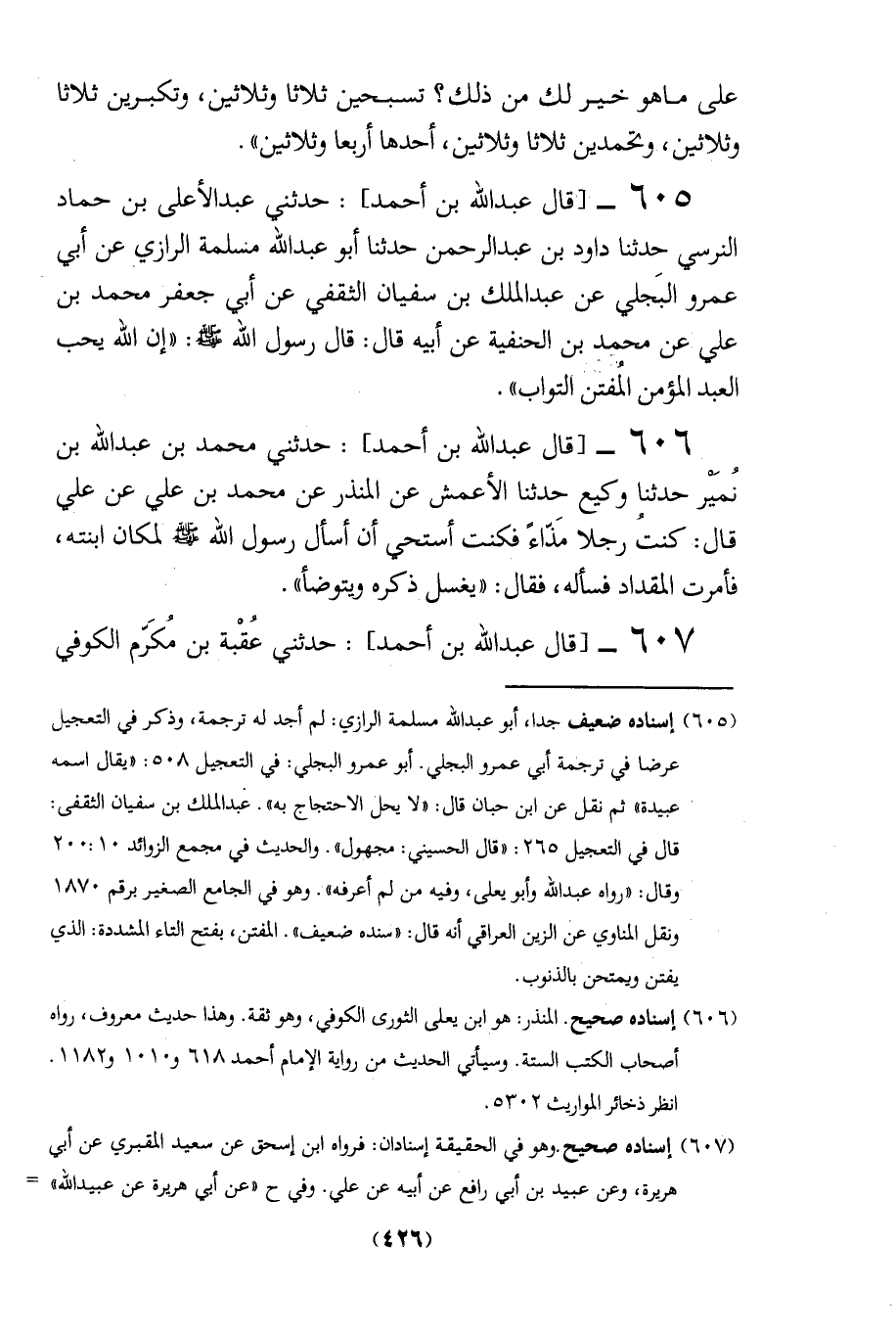 605 - [قال عبد الله بن أحمد]: حدثني عبد الأعلى بن حماد النرسي حدثنا داود بن عبد الرحمن حدثنا أبو عبد الله مسلمة الرازي عن أبي عمرو البَجلي عن عبد الملك بن سفيان الثقفي عن أبي جعفر محمد بن علي عن محمد بن الحنفية عن أبيه قال: قال رسول الله - صلى الله عليه وسلم -: "إن الله يحب العبد المؤمن المُفتن التواب".
