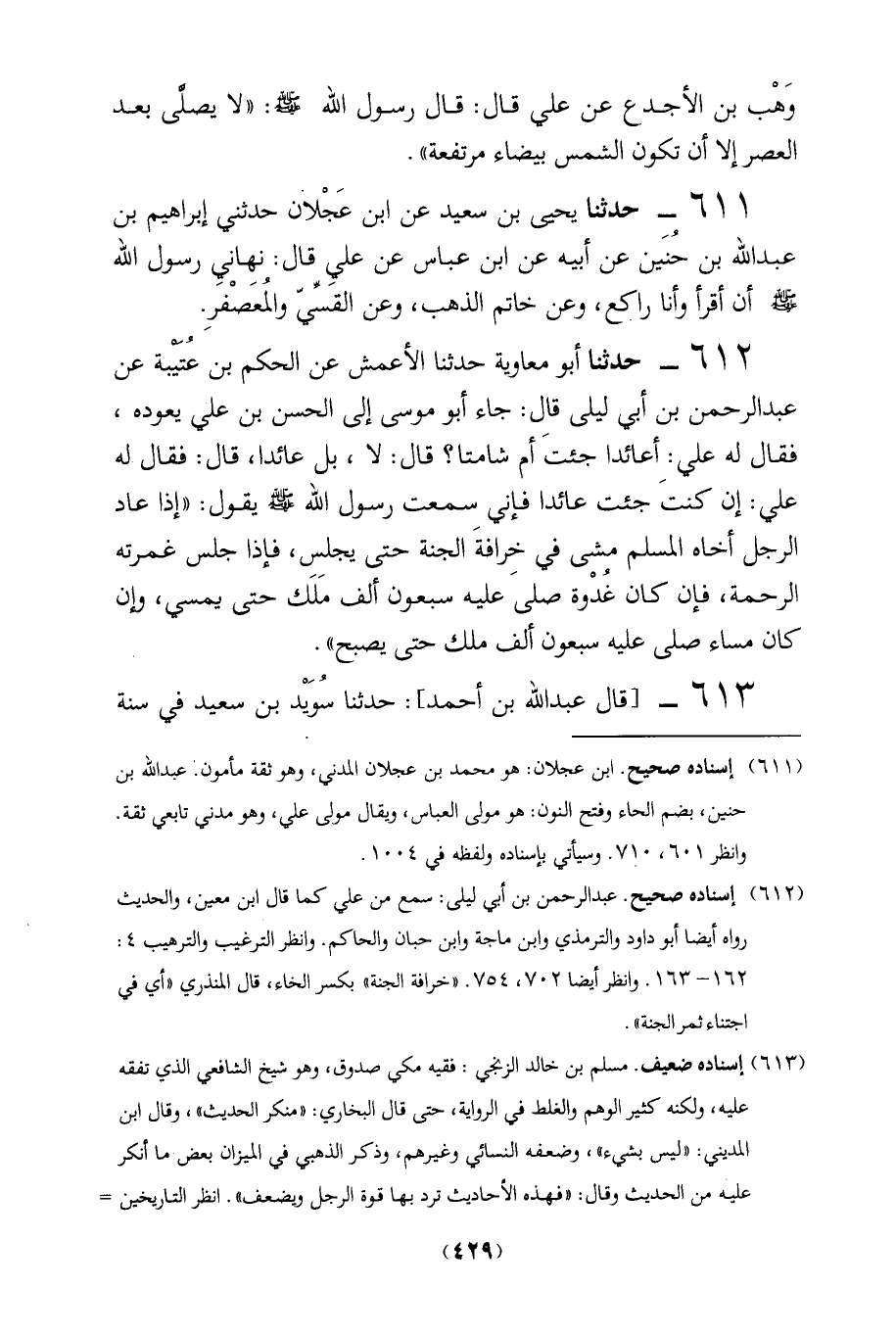 (611) إسناده صحيح. ابن عجلان: هو محمد بن عجلان المدني، وهو ثقة مأمون. عبد الله بن حنين، بضم الحاء وفتح النون: هو مولى العباس، ويقال مولى علي، وهو مدني تابعي ثقة.