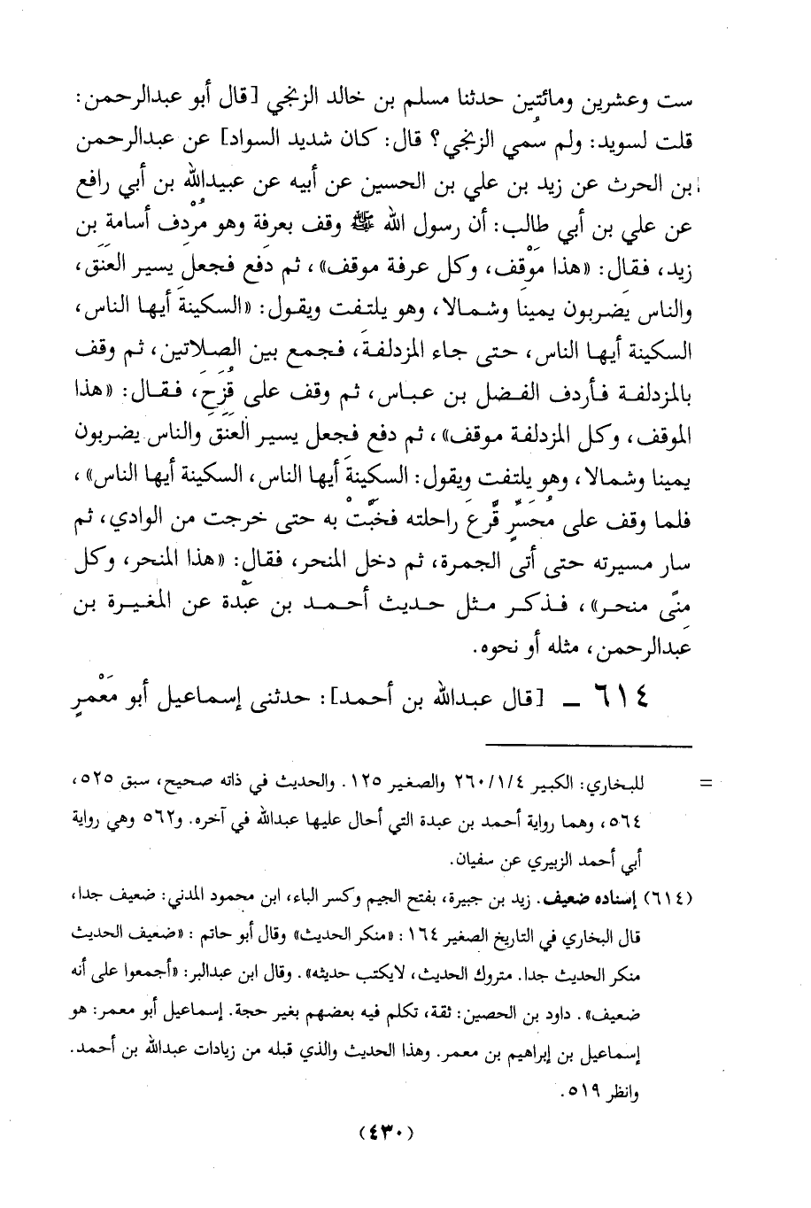 ست وعشرين ومائتين حدثنا مسلم بن خالد الزنجي [قال أبو عبد الرحمن: قلت لسويد: ولم سُمي الزنجي؟ قال: كان شديد السواد]، عن عبد الرحمن إبن الحرث عن زيد بن على بن الحسين عن أبيه عن عبيد الله بن أبي رافع عن على بن أبي طالب: أن رسول الله - صلى الله عليه وسلم - وقف بعرفِة وهو مُرْدِف أسامة بن زيد، فقال: "هذا مَوْقِف، وكل عرفة موقف"، ثم دفع فجعل يسير العَنَق، والناس يَضربون يمينا وشمالا، وهو يلتفت ويقول: "السكينةَ أيها الناس، السكينة أيها الناس، حتى جاء المزدلفةَ، فجمع بين الصِلِاتين، ثم وقف بالمزدلفة فأردف الفضل بن عباس، ثم وقف على قُزحِ، فقال: "هذا الموقف، وكل المزدلفة موقف"، ثم دفع فجعل يسير اْلعَنَق والناس يضربون يمينا وشمالا، وهو يلتفت ويقول: السكينةَ أيها الناس، السكينة أيها الناس"، فلما وقف على مُحَسِّرٍ قرعَ راحلته فخَبَّتْ به حتى خرجت من الوادي، ثم سار مسيرته حتى أتى الجمرة، ثم دخل المنحر، فقال: "هذا المنحر، وكل مِنًى منحر"، فذكر مثل حديث أحمد بن عَبْدة عن المغيرة بن عَبدالرحمن، مثله أو نحوه.