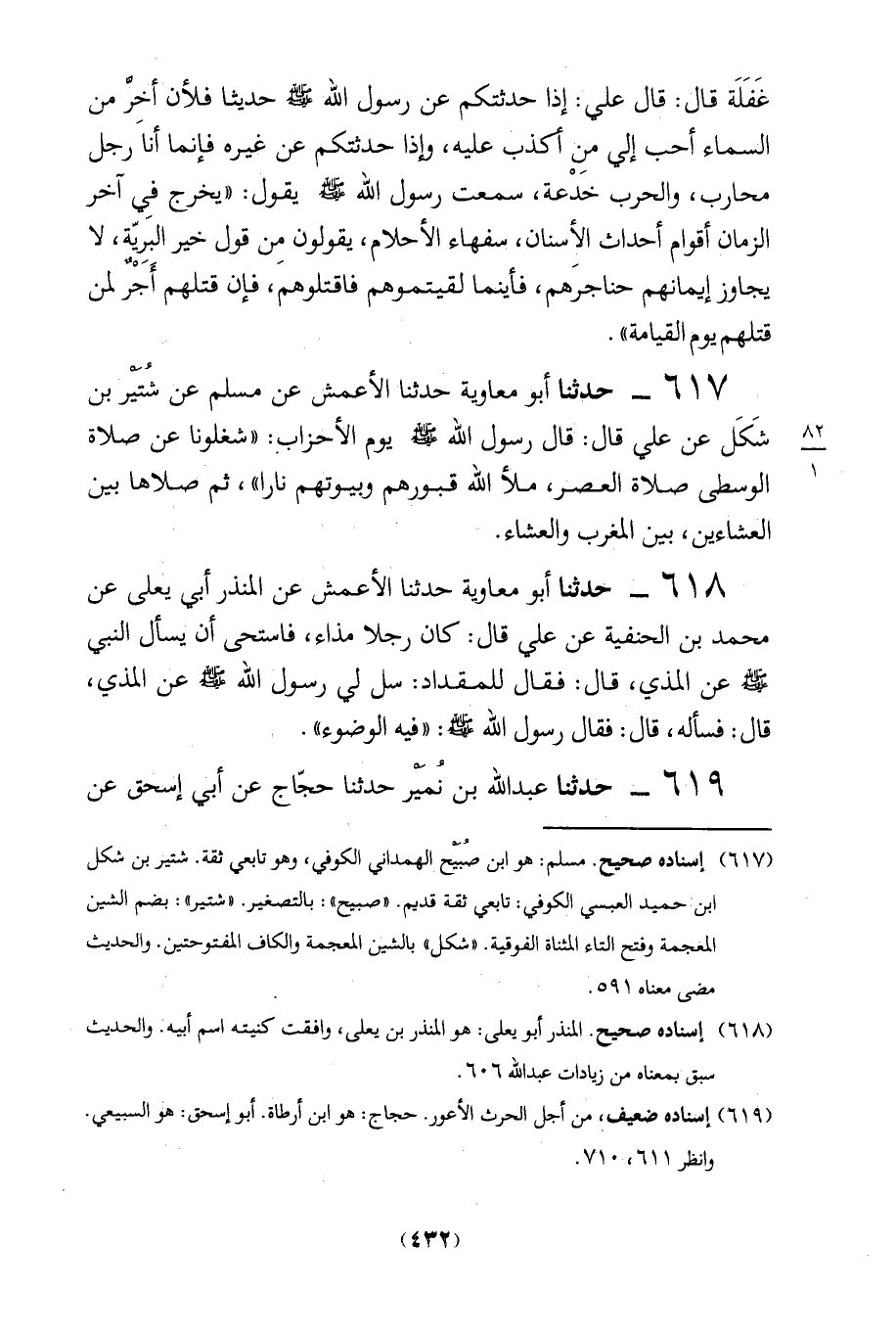 (617) إسناده صحيح. مسلم: هو ابن صُبَيْح الهمداني الكوفي، وهو تابعي ثقة. شتير بن شكل ابن حميد العبسي الكوفي: تابعى ثقة قديم. "صبيح": بالتصغير. "شتير": بضم الشين المعجمة وفتح التاء المثناة الفوقية. "شكل" بالشين المعجمة والكاف المفتوحتين. والحديث مضى معناه 591.
