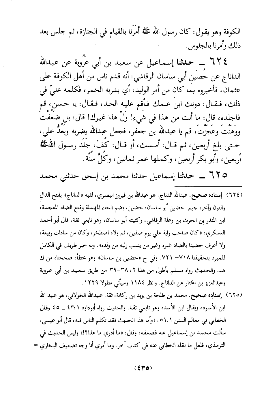 624 - حدثنا إسماعيل عن سعيد بن أبي عَرُوبة عن عبد الله الداناج عن حُضَين أبي ساسان الرقاشي: أنه قدم ناس من أهل الكوفة على عثمان، فأخبروه بما كان من أمر الوليد، أي بشربه الخمر، فكلمه عليّ في ذلك، فقال: دونك ابنَ عمك فأقم عليه الحد، فقال: يا حسنِ، قمِ فاجلده، قالِ: مِا أنت من هذا في شَيء! وَلِّ هذا غيرك! قال: بلِ ضعُفْت ووَهنتَ وعَجزْت، قم يا عبد الله بن جعفر، فجعل عبد الله يضربه ويَعُدُّ علي، حتى بلغ أربعين، ثم قال: أمسك، أو قال: كُفّ، جَلَد رسول الله - صلى الله عليه وسلم - أربعين، وأبو بكر أربعين، وكملها عمر ثمانين، وكُل سُنة.