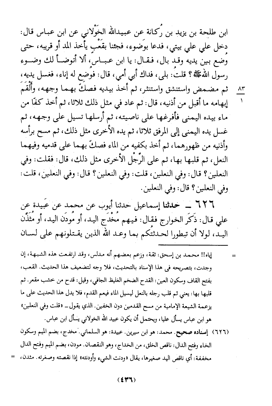 ابن طلحة بن يزيد بن رُكانة عِن عبيد الله الخَوْلاني عن ابن عباس قال: د خل علي علي بيتي، فدعا بوضوء، فجئنا بقَعْبٍ يأخذ المد أو قريبه، حتى وضع بين يديه وقد بال، فقال: يا ابن عباس، ألا أتوضأ لك وضوء رسول الله - صلى الله عليه وسلم -؟ قلتُ: بلى، فداك أبي أمي، قال: فوضِع له إناء، فغسل يديه، ثم مضمض واستنشق واستنثر، ثم أخذ بيديه فصكّ بهما وجهه، وأَلْقَمَ إبهامه ما أقبل من أذنيه، قال: ثم عاد في مثل ذلك ثلاثا، ثم أخذ كفّا من ماء بيده اليمنى فأفرغها على ناصيته، ثم أرسلها تسيل على وجهه، ثم غسل يده اليمنى إلى المرفق ثلاثا، ثم يده الأخرى مثل ذلك، ثم مسح برأسه وأذنيه من ظهورهما، ثم أخذ بكفيه من الماء فصكّ بهما على قدميه وفيهما النعل، ثم قلبها بها، ثم على الرِّجْل الأخرى مثل ذلك، قال: فقلت: وفى النعلين؟ قال: وفى النعلين، قلت: وفى النعلين؟ قال: وفي النعلين، قلت: وفى النعلين؟ قال: وفى النعلين.
