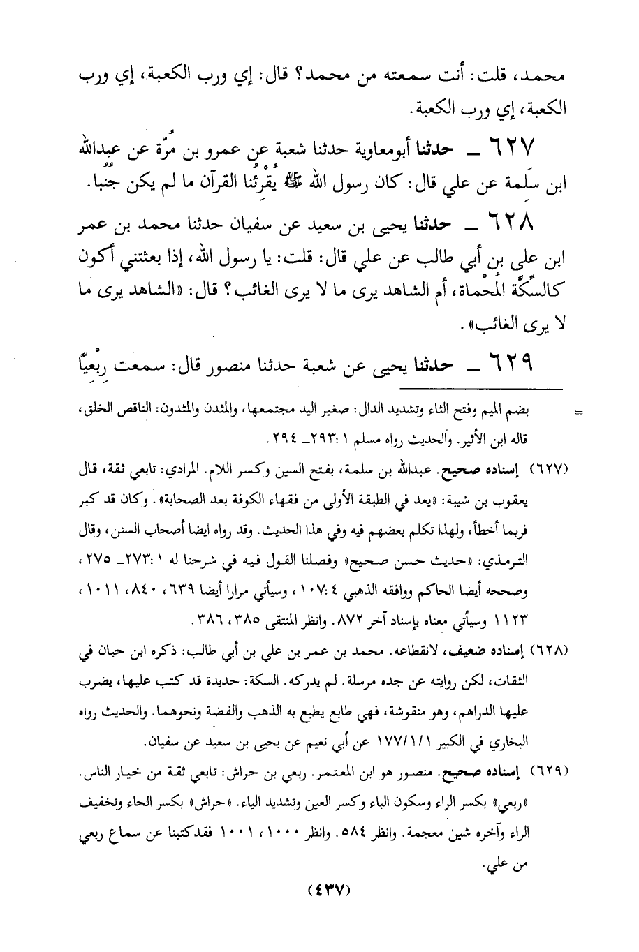 (629) إسناده صحيح. منصور هو ابن المعتمر. ربعي بن حراش: تابعي ثقة من خيار الناس.