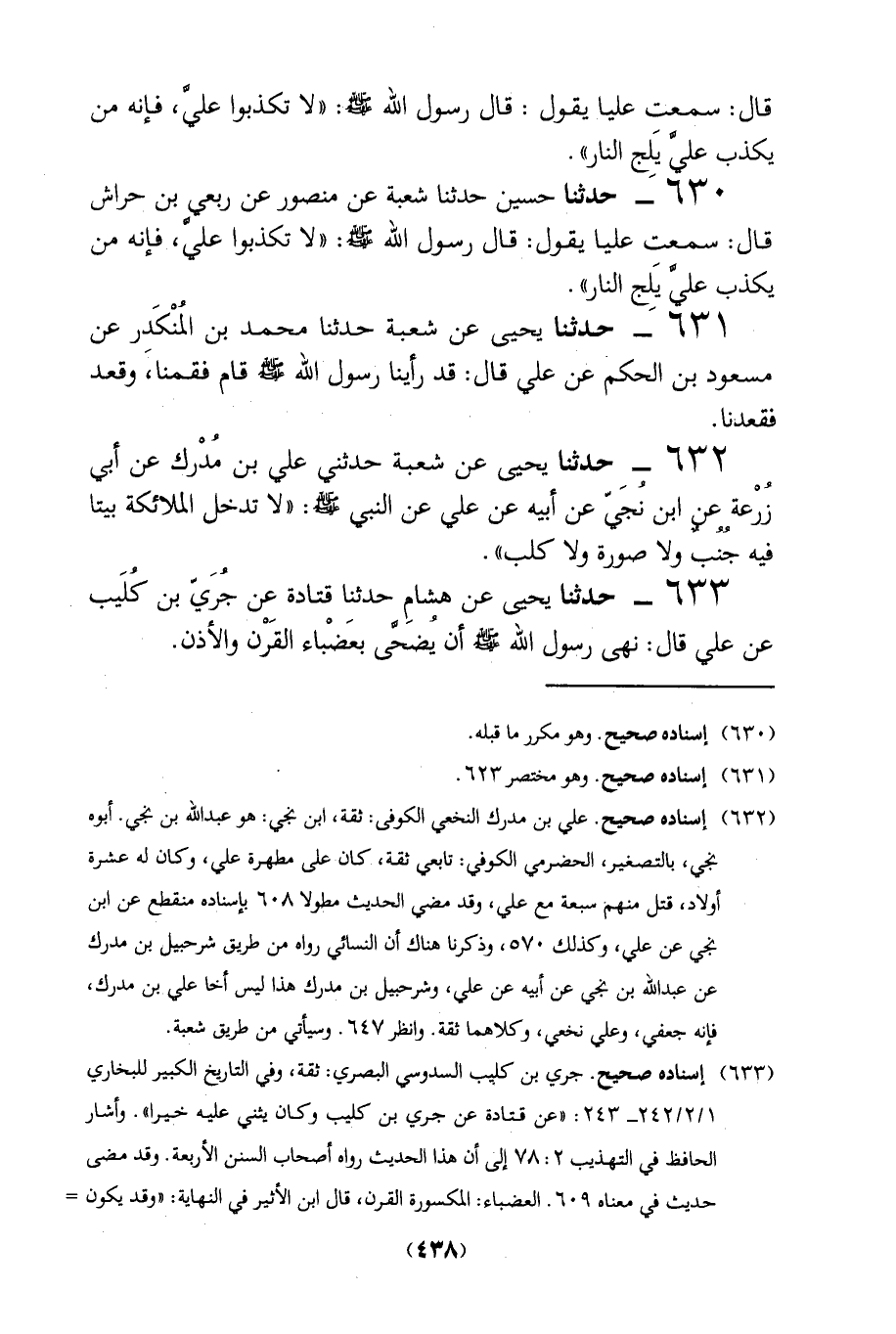 630 - حدثنا حسين حدثنا شعبة عن منصورعن ربعي بن حراش قال: سمعت عليا يقول: قال رسول الله - صلى الله عليه وسلم -: "لا تكذبوا علي، فإنه من يكذب علي يَلج النار".