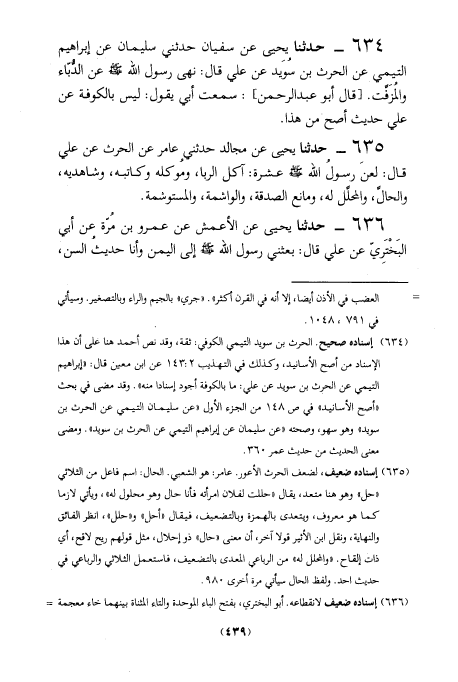 (635) إسناده ضعيف، لضعف الحرث الأعور. عامر: هو الشعبي. الحال: اسم فاعل من الثلاثي "حل" وهو هنا متعد، يقال "حللت لفلان امرأته فأنا حال وهر محلول له"، ويأتي لازما كما هو معروف، ويتعدى بالهمزة وبالتضعيف، فيقال "أحل"، و"حلل"، انظر الفائق والنهاية، ونقل ابن الأثير قولا آخر، أن معنى "حال" ذو إحلال، مثل قولهم ريح لاقح، أي ذات إلقاح. "والمحلل له" من الرباعي المعدى بالتضعيف، فاستعمل الثلاثي والرباعي في حديث احد. ولفظ الحال سيأتي مرة أخرى 980.
