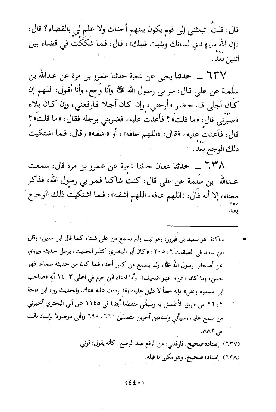 638 - حدثنا عفان حدثنا شعبة عن عمرو بن مرة قال: سمعت عبد الله بن سَلمة عن علي قال: كنتُ شاكيا فمر بي رسول الله، فذكر مِعناه، إلا أنه قَال: "اللهم عافه، اللهم اشفه"، فما اشتكيتُ ذلك الوجع بعد.