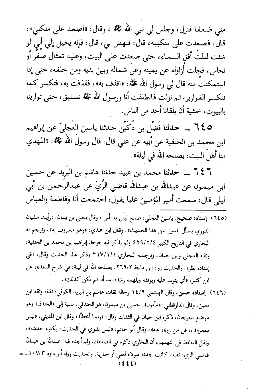 645 - حدثنا فَضْل بن دُكَيْن حدثنا ياسين العْجلىّ عن إبراهيم ابن محمد بن الحنفية عن أبيه عن علي قال: قال رسولَ الله - صلى الله عليه وسلم -: "المهدي منا أهلَ البيت، يصلحه الله في ليلة".