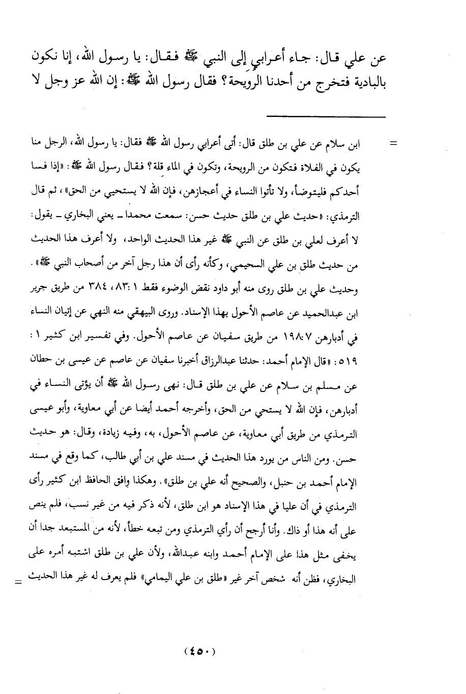 وحديث علي بن طلق روى منه أبو داود نقض الوضوء فقط1:83، 384 من طريق جرير ابن عبد الحميد عن عاصم الأحول بهذا الإسناد. وروى البيهقى منه النهى عن إتيان النساء في أدبارهن 7: 198 من طريق سفيان عن عاصم الأحول. وفى تفسير ابن كثير 1: 519: "قال الإمام أحمد: حدثنا عبد الرزاق أخبرنا سفيان عن عاصم عن عيسى بن حطان عن مسلم بن سلام عن علي بن طلق قال: نهى رسول الله - صلى الله عليه وسلم - أن يؤتى النساء في أدبارهن، فإن الله لا يستحي من الحق، وأخرجه أحمد أيضا عن أبي معاوية، وأبو عيسى الترمذي من طريق أبي معاوية، عن عاصم الأحول، به، وفيه زيادة، وقال: هو حديث حسن. ومن الناس من يورد هذا الحديث في مسند علي بن أبي طالب، كما وقع في مسند الإمام أحمد بن حنبل، والصحيح أنه علي بن طلق". وهكذا وافق الحافظ ابن كثير رأى الترمذي في أن عليا في هذا الإسناد هو ابن طلق، لأنه ذكر فيه من غير نسب، فلم ينص على أنه هذا أو ذاك. وأنا أرجح أن رأي الترمذي ومن تبعه خطأ، لأنه من المستبعد جدا أن يخفى مثل هذا على الإمام أحمد وابنه عبد الله، ولأن علي بن طلق اشتبه أمره على البخاري، فظن أنه شخص آخر غير "طلق بن علي اليمامى" فلم يعرف له غير هذا الحديث =