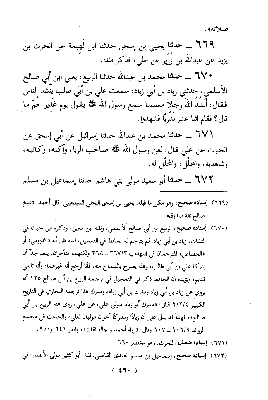 670 - حدثنا محمد بن عبد الله حدثنا الربيع، يعني ابن أبي صالح الأسلمي، حدثني زياد بن أبي زياد: سمعت على بن أبي طالب يَنْشُد الناس فقال: أْشُدُ الله رجلا مسلما سمع رسول الله - صلى الله عليه وسلم - يقول يوم غَدير خُمّ ما قال؟ فقام اثنا عشر بَدْرياً فشهدوا.