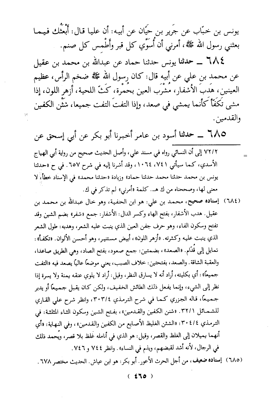 (684) إسناده صحيح، محمد بن على: هو ابن الحنفية، وهو خال عبد الله بن محمد بن عقيل. هدب الأشفار، بفتح الهاء وكسر الدال: الأشفار: جمع "شفر" بضم الشين وقد تفتح وسكون الفاء، وهو حرف جفن العين الذي ينبت عليه الشعر، وهدبه: طول الشعر الذي ينبت عليه وكثرته. "أزهر اللون"، أبيض مستنير، وهو أحسن الألوان. "تكفأ": تمايل إلى قُدَّام. "الصعد"، بضمتين: جمع صعود، بفتح الصاد، وهي الطريق صاعدا، والعقبة الشاقة. والصعد، بفتحتين: خلاف الصبب، يعنى موضعاً عاليَّا يصعد فيه التفت جميعاً،: أي بكليته، أراد أنه لا يسارق النظر، وقيل: أراد لا يلوي عنقه يمنة ولا يسرة إذا نظر إلى الشيء، وإنما يفعل ذلك الطائش الخفيف، ولكن كان يقبل جميعاً أو يدبر جميعاً، قاله الجزري كما في شرح الترمذي 4/ 303، وانظر شرح على القاري للشمائل 1/ 32. "شنن الكفين والقدمين"، بفتح الشين وسكون الثاء المثلثة: في الترمذي 4/ 304: "الشثن الغليظ الأصابع من الكفين والقدمين"، وفي النهاية: "أي أنهما يميلان إلى الغلظ والقصر، وقيل: هو الذي في أنامله غلظ بلا قصر، ويحمد ذلك في الرجال، لأنه أشد لقبضهم، ويذم في النساء". وانظر 744 و 746.