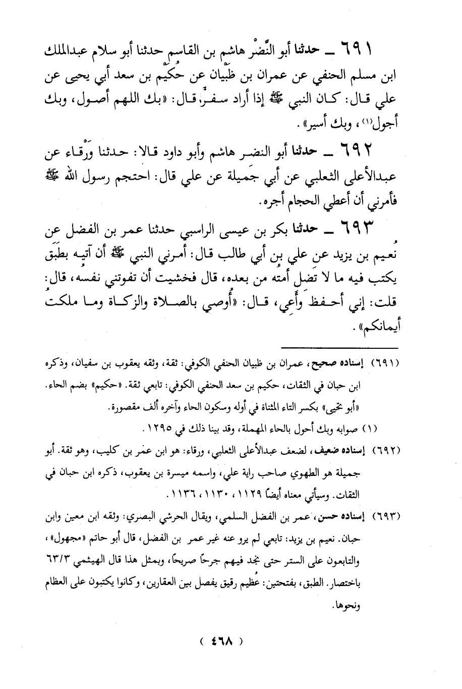 (691) إسناده صحيح، عمران بن ظبيان الحنفي الكوفي: ثقة، وثقه يعقوب بن سفيان، وذكره ابن حبان في الثقات، حكيم بن سعد الحنفي الكوفي: تابعى ثقة. "حكيم" بضم الحاء.