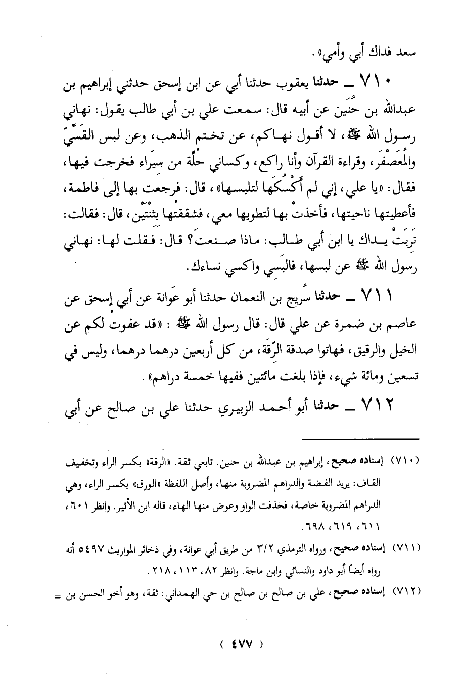 710 - حدثنا يعقوب حدثنا أبى عن ابن إسحق حدثني إبراهيم بن عبد الله بن حُنَين عن أبيه قال: سمعت علي بن أبي طالب يقول: نهاني رسول الله - صلى الله عليه وسلم -، لا أقول نهاكم، عن تختيم الذهب، وعن لبس القَسِّيَّ والمُعَصْفَر، وقراءة القرآن وأنا راكع، وكساني حُلَّة من سيَراء فخرجت فيها، فقال: "يا علي، إني لم أكْسُكَها لتلبسها"، قال: فرجعت بها إلىْ فاطمة، فأعطيتها ناحيتها، فأخذتْ بها لتطويها معي، فشققتُها بِثنْتَيْن، قال: فقالت: تَرَبَتْ يداك يا ابن أبي طالب: ماذا صنعتَ؟ قال: َ فَقلت لها: نهاني رسول الله - صلى الله عليه وسلم - عن لبسها، فالبَسِي واكسي نساءك.