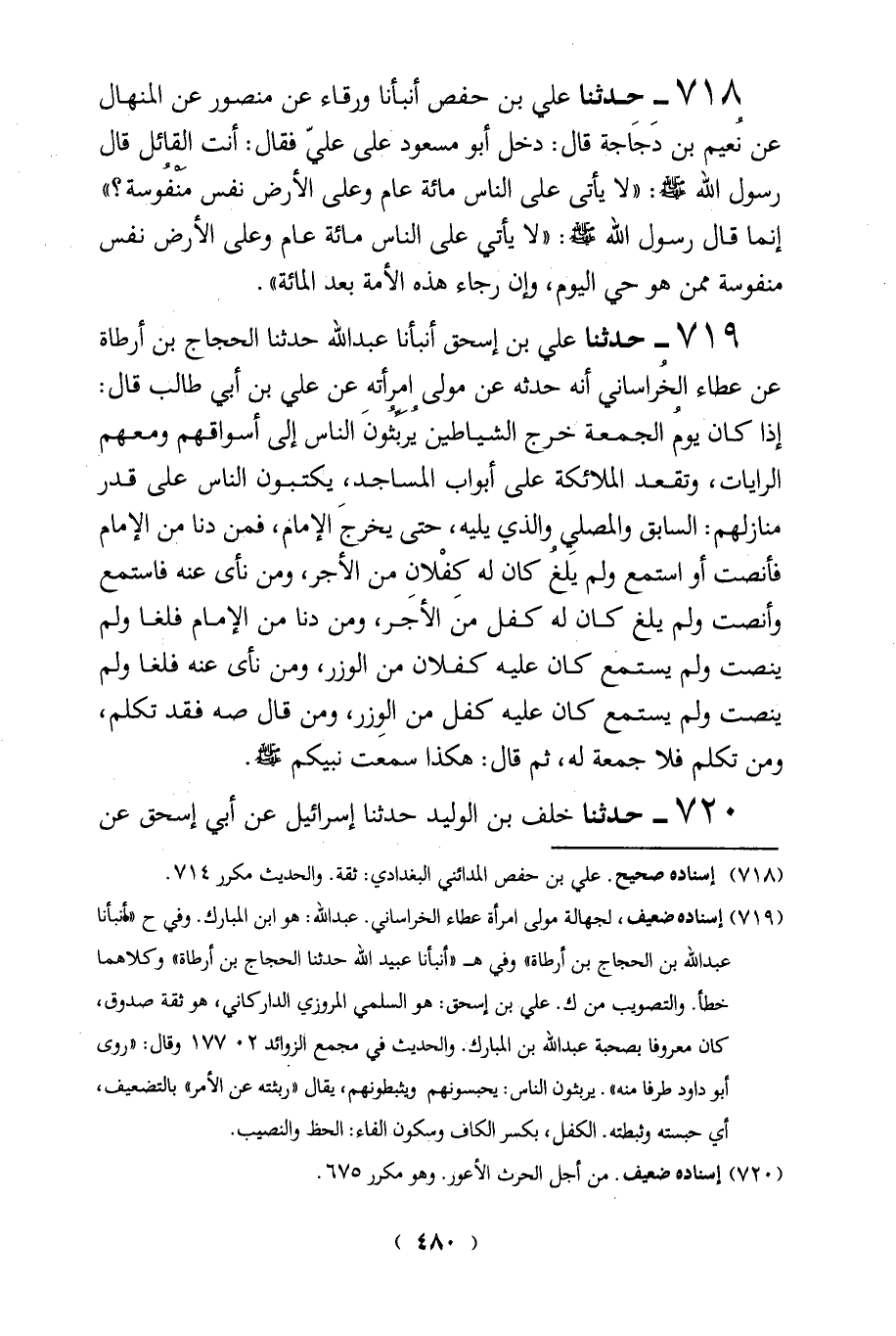 718 - حدثنا علي بن حفص أنبأنا ورقاء عن منصورعن المنهال عن نُعيم بن دَجَاجة قال: دخل أبو مسعود على عليّ فقال: أنت القائل قال رسول الله - صلى الله عليه وسلم -: "لا يأتي على الناس مائة عام وعلى الأرض نفس مَنْفُوسة؟ " إنما قال رسول الله - صلى الله عليه وسلم -: "لا يأتي على الناس مائة عام وعلى الأرض نفس منفوسة ممن هو حي اليوم، وإن رجاء هذه الأمة بعد المائة".