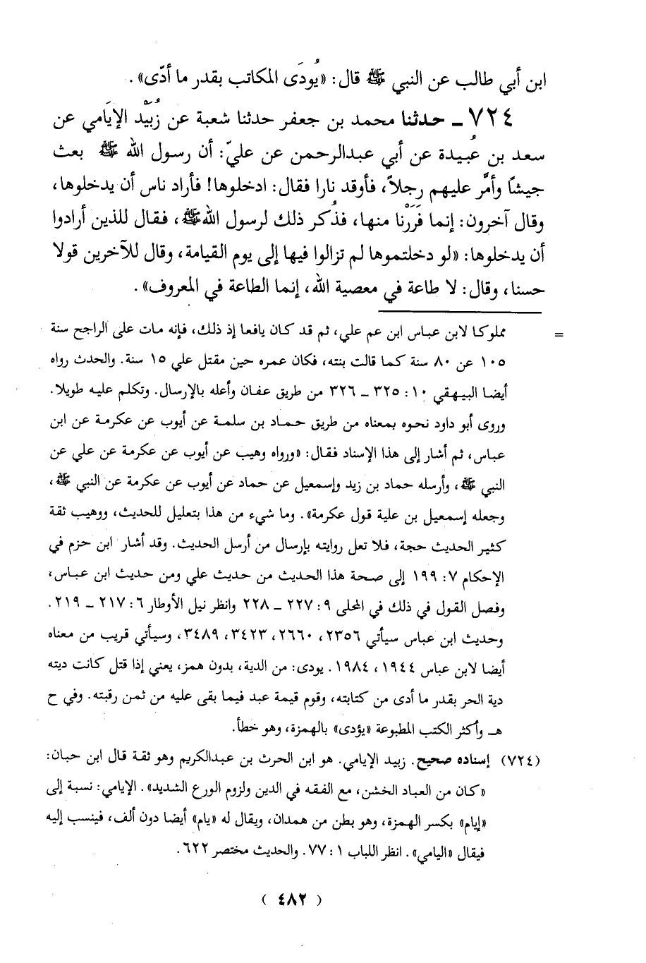 724 - حدثنا محمد بن جعفر حدثنا شعبة عن زبيد الإيَامي عن سعد بن عُبيدة عن أبي عبد الرحمن عن عليّ: أن رسول الله - صلى الله عليه وسلم - بعث جيشاً وأمر عليهم رِجلاً، فأوقد نارا فقال: ادخلوها! فأراد ناس أن يدخلوها، وقال آخرون: إنما فرَرْنا منها، فذُكر ذلك لرسول الله - صلى الله عليه وسلم -، فقال للذين أرادوا أن يدخلوها: "لو دخلتموها لم تزالوا فيها إلى يوم القيامة، وقال للآخرين قولا حسنا، وقال: لا طاعة في معصية الله، إنما الطاعة في المعروف".