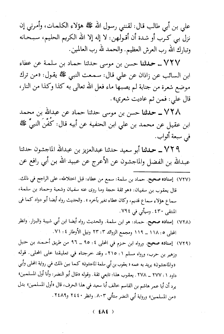 728 - حدثنا حسن بن موسى حدثنا حماد عن عبد الله بن محمد ابن عقيل عن محمد بن على ابن الحنفيه عن أبيه قال: كُفِّنَ النبي - صلى الله عليه وسلم - في سبعة أثواب.