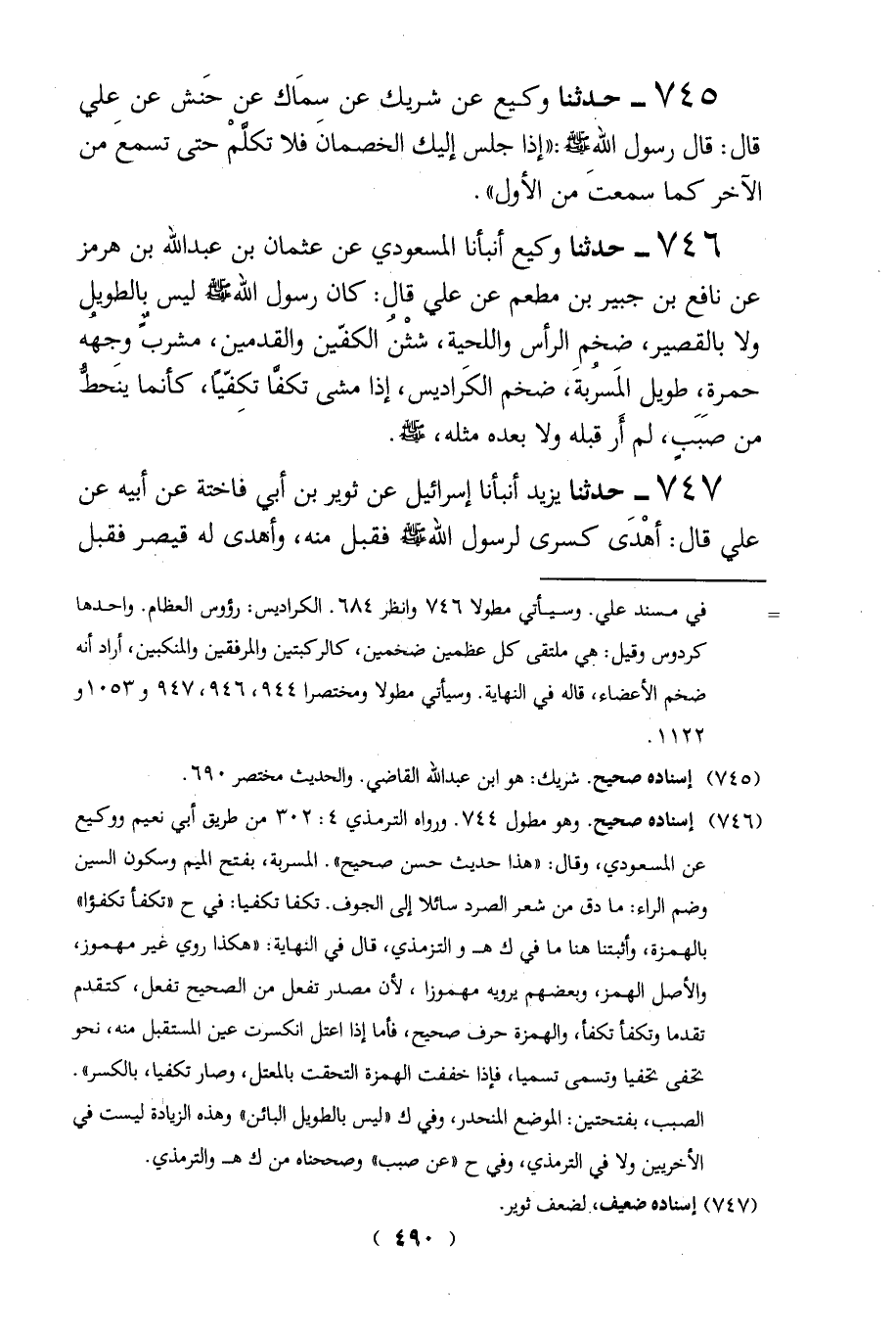 746 - حدثنا وكيع أنبأنا المسعودي عن عثمان بن عبد الله بن هرمز عن نافع بن جبير بن مطعم عن علي قال: كان رسول الله - صلى الله عليه وسلم - ليس بالطويل ولا بالقصير، ضخمِ الرأس واللحية، شثْنُ الكفّين والقدمين، مشربٌ وجهُه حمرة، طويل المَسُربةَ، ضخم الكَراديس، إذا مشى تكفَّا تكفّياً، كأنما ينَحطُّ من صَبَبٍ، لم أَرقبله ولا بعده مثله، - صلى الله عليه وسلم -.
