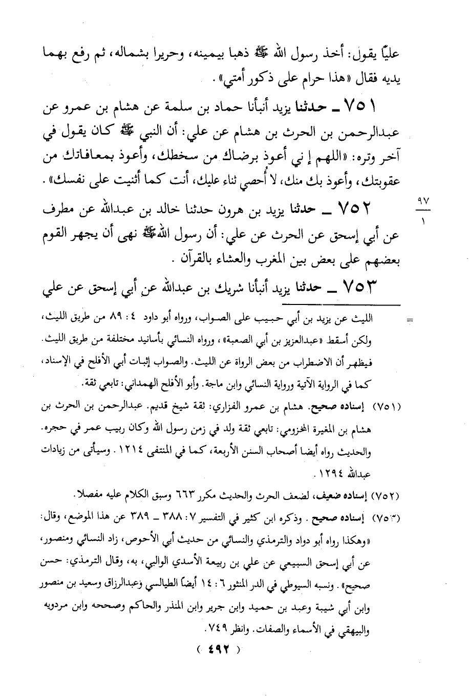 751 - حدثنا يزيد أنبأنا حماد بن سلمة عن هشام بن عمرو عن عبد الرحمن بن الحرث بن هشام عن على: أن النبى - صلى الله عليه وسلم - كان يقول في آخر وتره: "اللهم إني أعوذ برضاك من سخطك، وأعوذ بمعافاتك من عقوبتك، وأعوذ بك منك، لا أُحصي ثناء عليك، أنت كما أثنيت على نفسك".