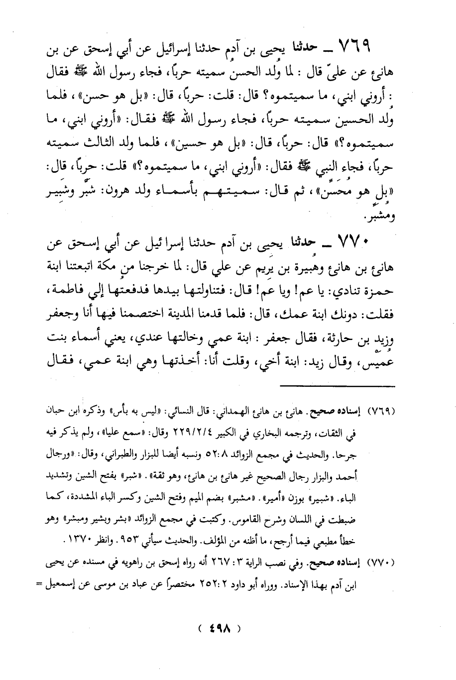769 - حدثنا يحيى بن آدم حدثنا إسرائيل عن أبي إسحق عن بن هانئ عن علىّ قال: لما وُلد الحسنُ سميته حرباً، فجاء رسول الله - صلى الله عليه وسلم - فقال: أروني ابني، ما سميتموه؟ قال: قلت: حرباً، قال: "بل هو حسن"، فلما وُلد الحسين سميته حرباً، فجاء رسول الله - صلى الله عليه وسلم - فقال: "أروني ابني، ما سميتموه؟ " قال: حرباً، قال: "بل هو حسين"، فلما ولد الثالث سميته حربًا، فجاء النبي - صلى الله عليه وسلم - فقال: "أروني ابني، ما سميتموه؟ " قلت: حرباً، قِال: "بل هو ُمحَسِّن"، ثم قال: سميتهم بأسماء ولد هرون: شَّبر وشَبِير ومُشَّبر.