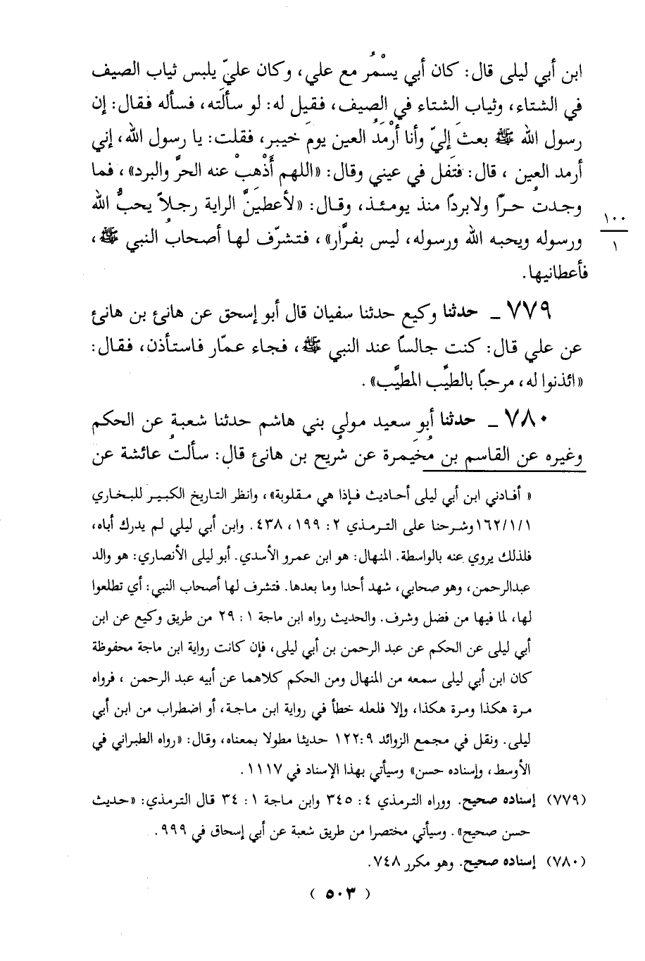 779 - حدثنا وكيع حدثنا سفيان قال أبو إسحق عن هانئ بن هانئ عن علي قال: كنت جالساً عند النبى - صلى الله عليه وسلم -، فجاء عمّارفاستأذن، فقال: "ائذنوا له، مرحباً بالطيِّب المطيَّب".