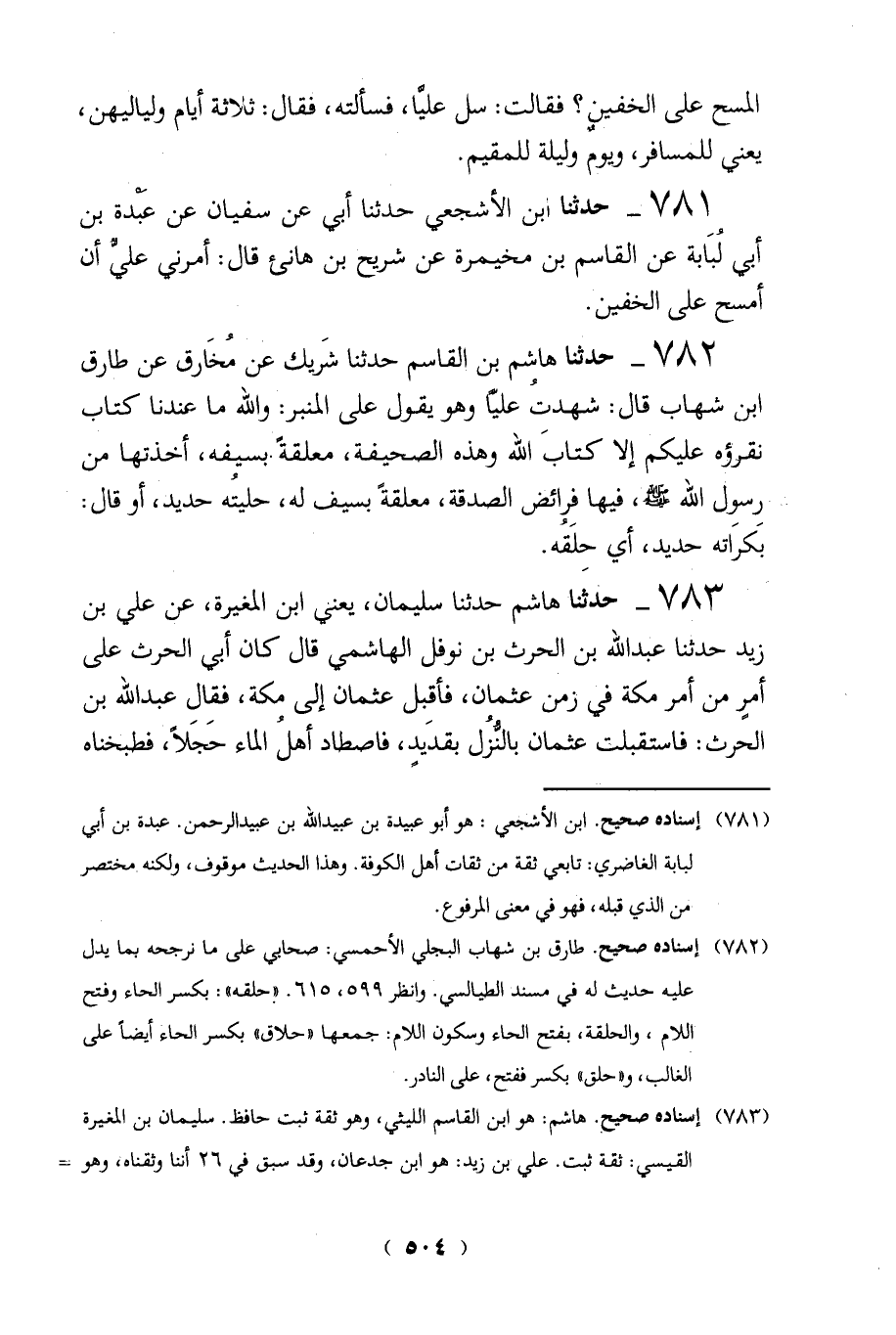 782 - حدثنا هاشم بن القاسم حدثنا شَريك عن مُخَارق عن طارق ابنه شهاب قال: شهدتُ عليَّا وهو يقول على المنبر: والله ما عندنا كتاب نقرؤه عليكم إلا كتابَ الله وهذه الصحيفة، معلقةً. بسيفه، أخذتها من رسول الله - صلى الله عليه وسلم -، فيها فرائض الصدقة، معلقةً بسيف له، حليتُه حديد، أو قال: بَكرَاته حديد، أي حِلَقُه.