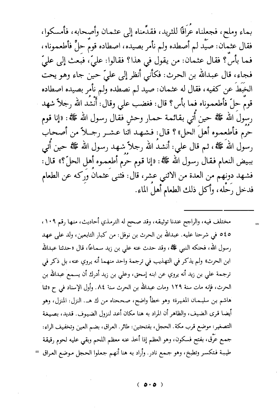 بماء وملح، فجعلناه عُرَاقاً للثريد، فقدَّمناه إلى عثمان وأصحابه، فأمسكوا، فقال عثمان: صيد لم أصطده ولم نأمر بصيده، اصطاده قومٌ حِلُّ فأطعموناه، فما بأسٌ؟ فقال عثمان: من يقول في هذا؟ فقالوا: عليّ، فبَعث إلى عليّ فجاء، قال عبد الله بن الحرث: فكأني أنظر إلى عليّ حين جاء وهو يحت الخَبَطَ عن كفيه، فقال له عثمان: صيد لم نصطده ولم نأمر بصيده اصطاده قومٌ حلّ فأطعموناه فما بأس؟ قال: فغضب علي وقال: أَنْشُد الله رجلاً شهد رسولَ الله - صلى الله عليه وسلم - حين أُتي بقائمة حمار وحشٍ فقال رسول الله - صلى الله عليه وسلم -: "إنا قوم حُرُم فأطعموه أهلَ الحل"؟ قال: فشهد اثنا عشر رجلاً من أصحاب رسول الله - صلى الله عليه وسلم -، ثم قال علي: أنشدُ الله رجلاً شهد رسول الله - صلى الله عليه وسلم - حين أُتي ببيض النعام فقال رسول الله - صلى الله عليه وسلم -: "إنا قوم حرُم أطعموه إهلِ الحلّ؟ " قال: فشهد دونهم من العدة من الاثني عشر، قال: فثنىَ عثمانُ وِرَكه عن الطعام فدخل رَحْله، وأكل ذلك الطعام أهلُ الماء.