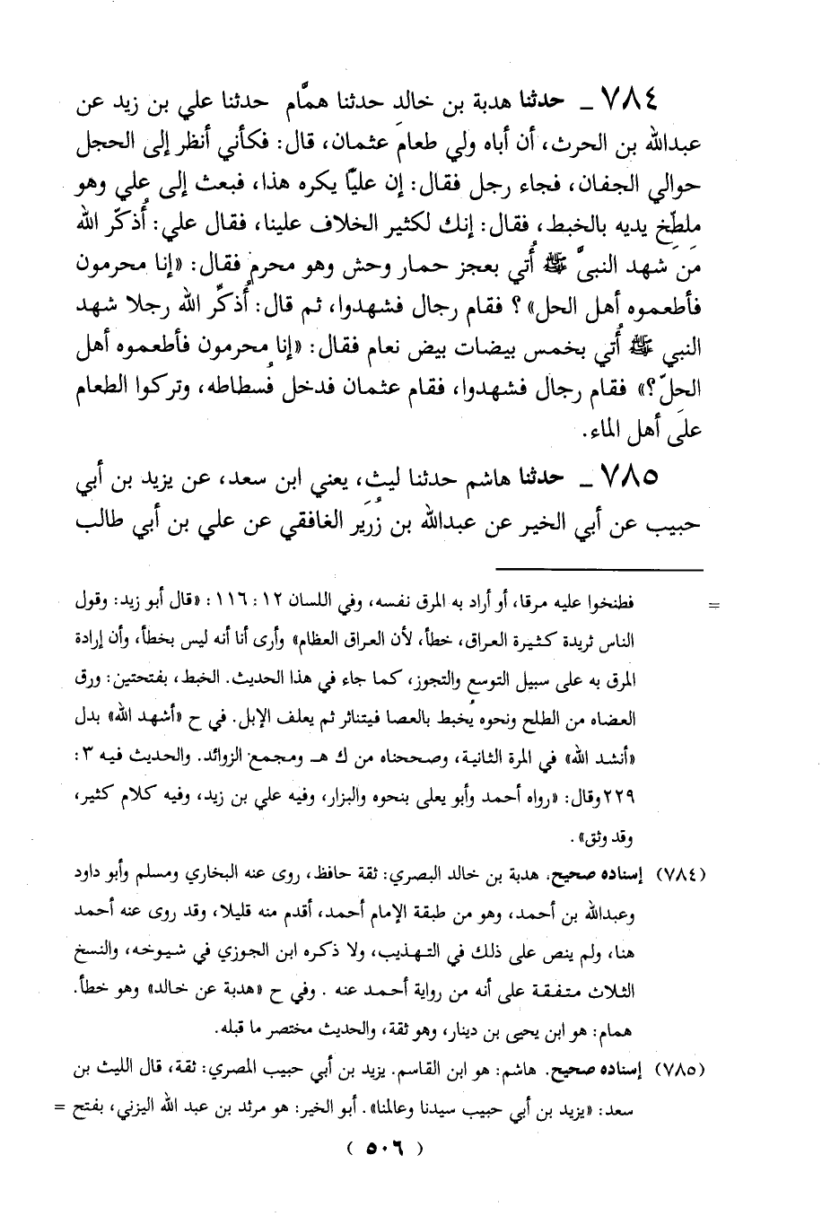 (784) إسناده صحيح: هدبة بن خالد البصري: ثقة حافظ، روى عنه البخاري ومسلم وأبو داود وعبد الله بن أحمد، وهو من طبقة الإمام أحمد، أقدم منه قليلا، وقد روى عنه أحمد هنا، ولم ينص على ذلك في التهذيب، ولا ذكره ابن الجوزي في شيوخه، والنسخ الثلاث متفقة على أنه من رواية أحمد عنه. وفى ح"هدبة عن خالد" وهو خطأ.