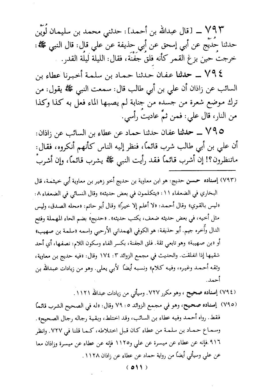 795 - حدثنا عفان حدثنا حماد عن عطاء بن السائب عن زاذان: أن علي بن أبي طالب شرب قائماً، فنظر إليه الناس كأنهم أنكروه، فقال: ماتنظرون؟! إن أشرب قائماً فقد رأيت النبي - صلى الله عليه وسلم - يشرب قائمًا، وإن أشربْ