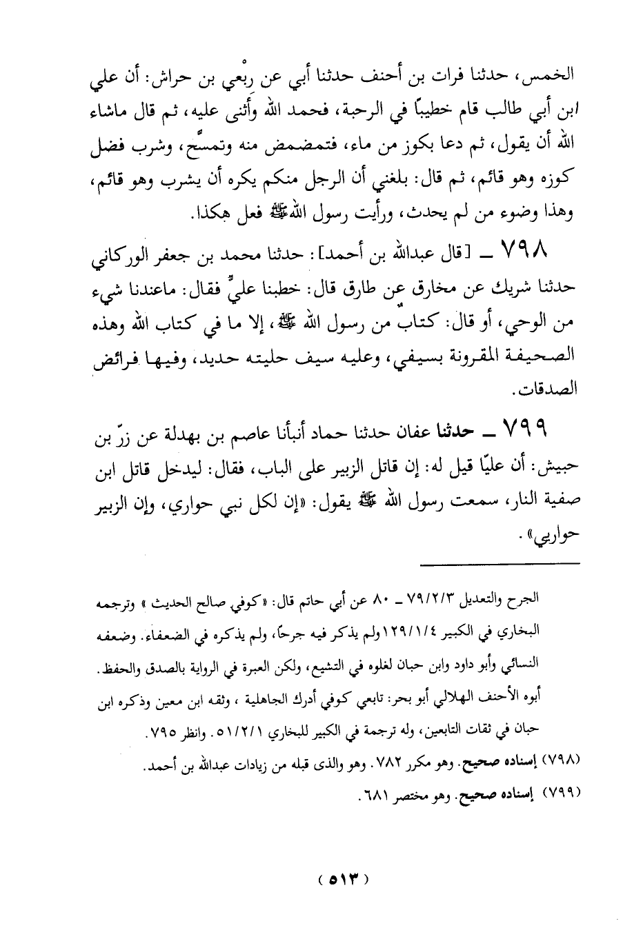 798 - [قال عبد الله بن أحمد]: حدثنا محمد بن جعفر الوركاني حدثنا شريك عن مخارق عن طارق قال: خطبنا عليُّ فقال: ماعندنا شيء من الوحي، أو قال: كتابٌ من رسول الله - صلى الله عليه وسلم -، إلا ما في كتاب الله وهذه الصحيفة المقرونة بسيفي، وعليه سيف حليته حديد، وفيها فرائض الصدقات.