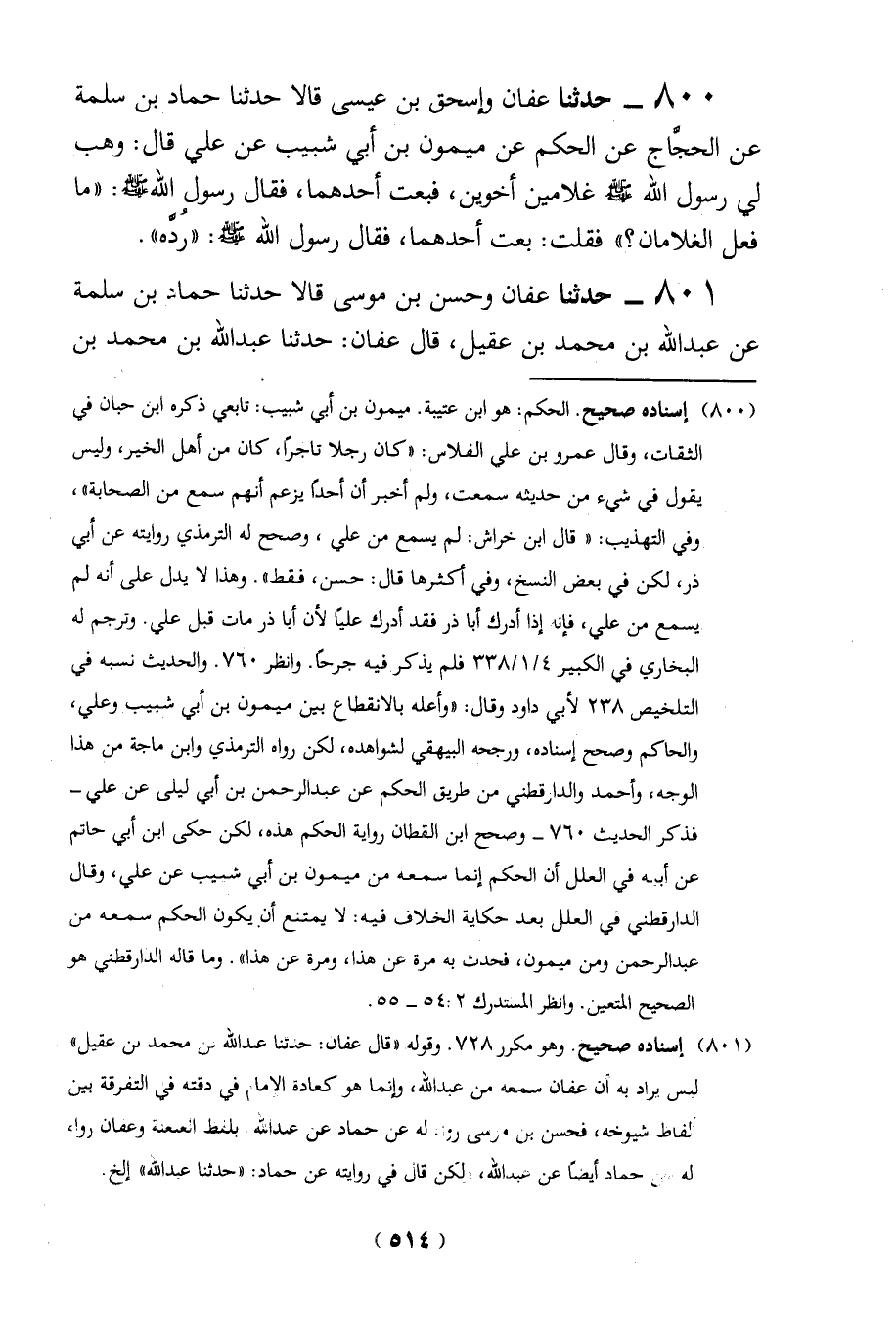800 - حدثنا عفان وإسحق بن عيسى قالا حدثنا حماد بن سلمة عن الحجَّاج عن الحكم عن ميمون بن أبي شبيب عن علي قال: وهب لي رسول الله - صلى الله عليه وسلم - غلامين أخوين، فبعت أحدهما، فقال رسول الله - صلى الله عليه وسلم -: "ما فعل الغلامان؟ " فقلت: بعت أحدهما، فقال رسول الله - صلى الله عليه وسلم -: "رُدَّه".