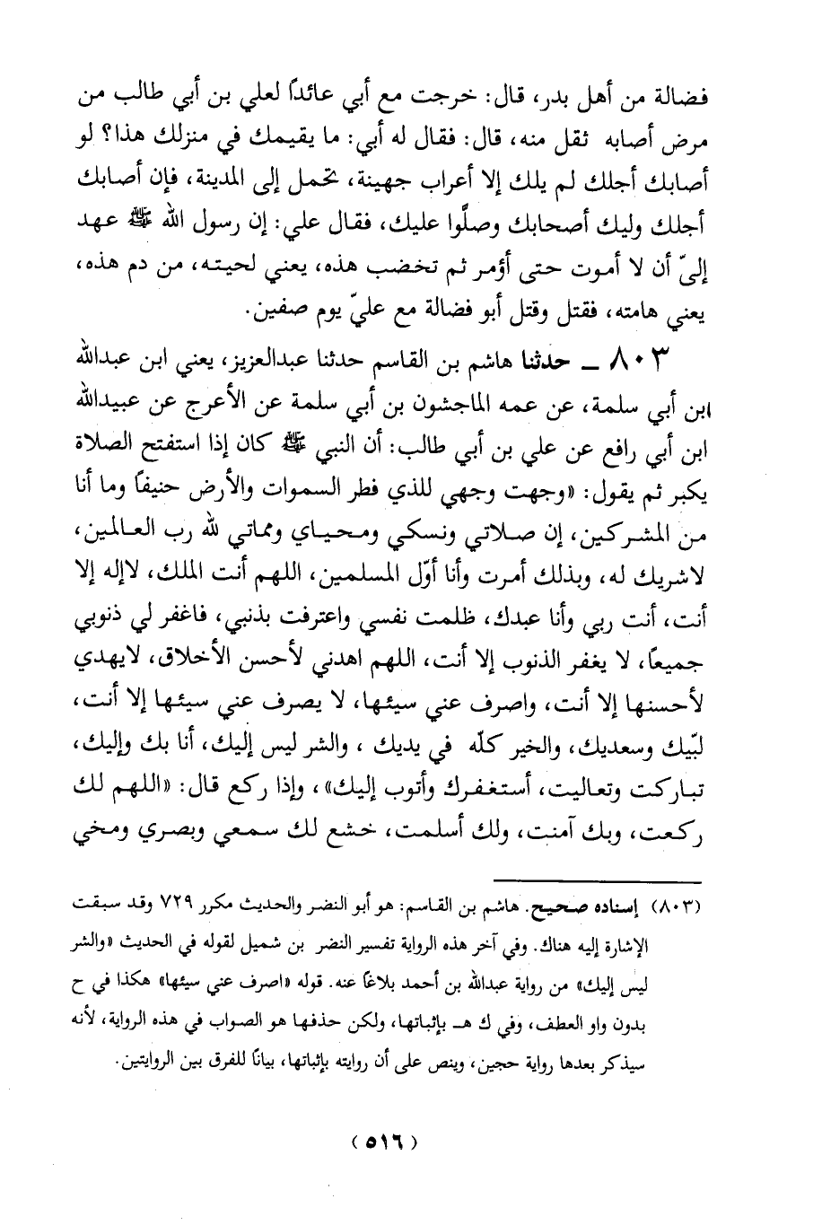 803 - حدثنا هاشم بن القاسم حدثنا عبد العزيز، يعنى ابن عبد الله ابن أبي سلمة، عن عمه الماجشون بن أبي سلمة عن الأعرج عن عبيد الله ابن أبي رافع عن علي بن أبي طالب: أن النبي - صلى الله عليه وسلم - كان إذا استفتح الصلاة يكبر ثم يقول: "وجهت وجهى للذي فطر السموات والأرض حنيفاً وما أنا من الشركين، إن صلاتي ونسكي ومحياي ومماتي لله رب العالمين، لاشريك له، وبذلك أمرت وأنا أوّل المسلمين، اللهم أنت الملك، لا إله إلا أنت، أنت ربي وأنا عبدك، ظلمت نفسي واعترفت بذنبي، فاغفر لي ذنوبي جميعاً، لا يغفر الذنوب إلا أنت، اللهم اهدني لأحسن الأخلاق، لايهدي لأحسنها إلا أنت، واصرف عني سيئها، لا يصرف عني سيئها إلا أنت، لبّيك وسعديك , والخير كلَّه في يديك، والشر ليس إليك، أنا بك وإليك، تباركت وتعاليت، أستغفرك وأتوب إليك"، وإذا ركع قال: "اللهم لك ركعت، وبك آمنت، ولك أسلمت، خشع لك سمعي وبصري ومخي