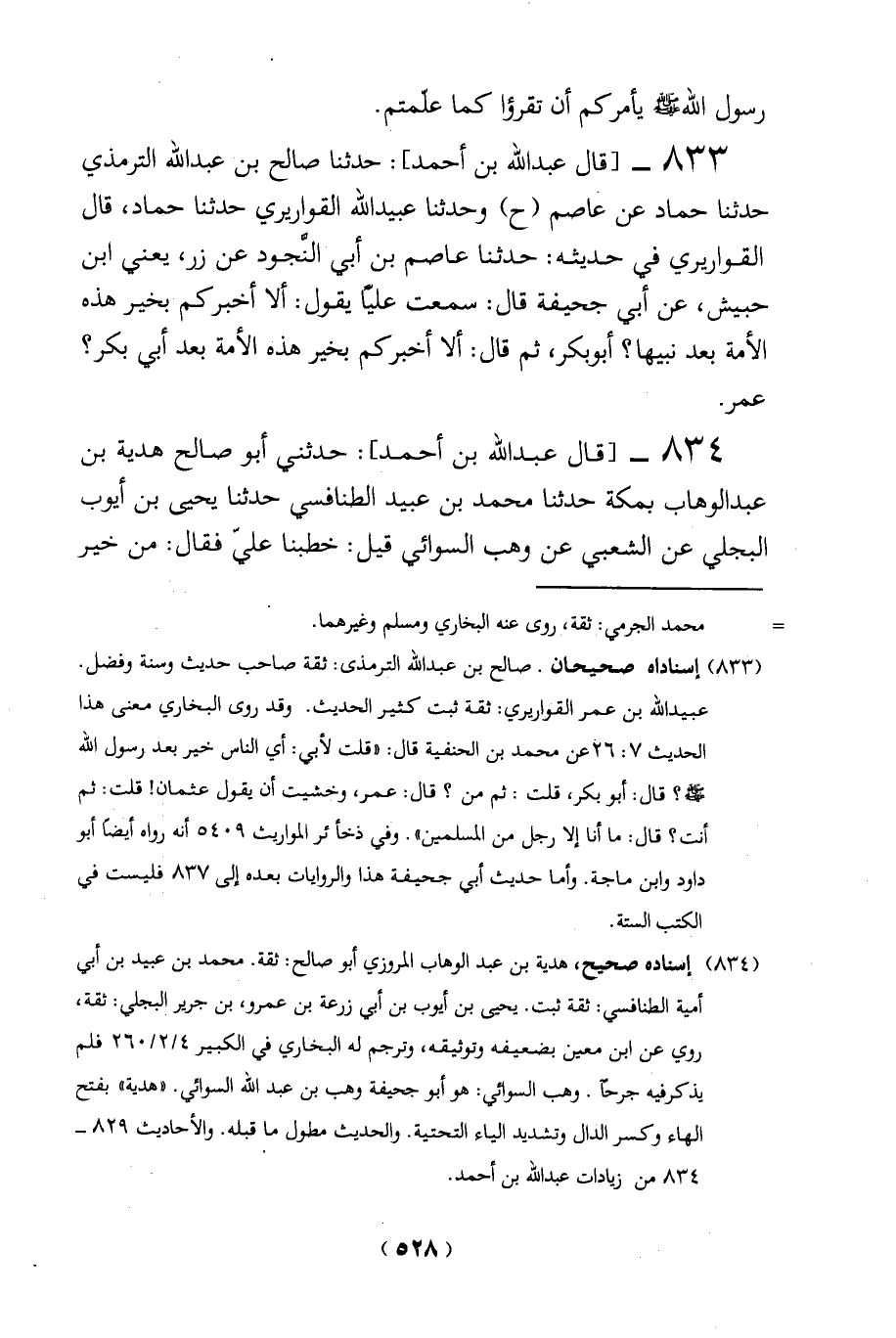 عبيد الله بن عمر القواريري: ثقة ثبت كثير الحديث. وقد روى البخاري معنى هذا الحديث 7: 26 عن محمد بن الحنفية قال: "قلت لأبى: أي الناس خير بعد رسول الله - صلى الله عليه وسلم -؟ قال: أبو بكر، قلت: ثم من؟ قال: عمر، وخشيت أن يقول عثمان! قلت: ثم أنت؟ قال: ما أنا إلا رجل من المسلمين". وفي ذخائر المواريث 5409 أنه رواه أيضاً أبو داود وابن ماجة. وأما حديث أبي جحيفة هذا والروايات بعده إلى 837 فليست في الكتب الستة.