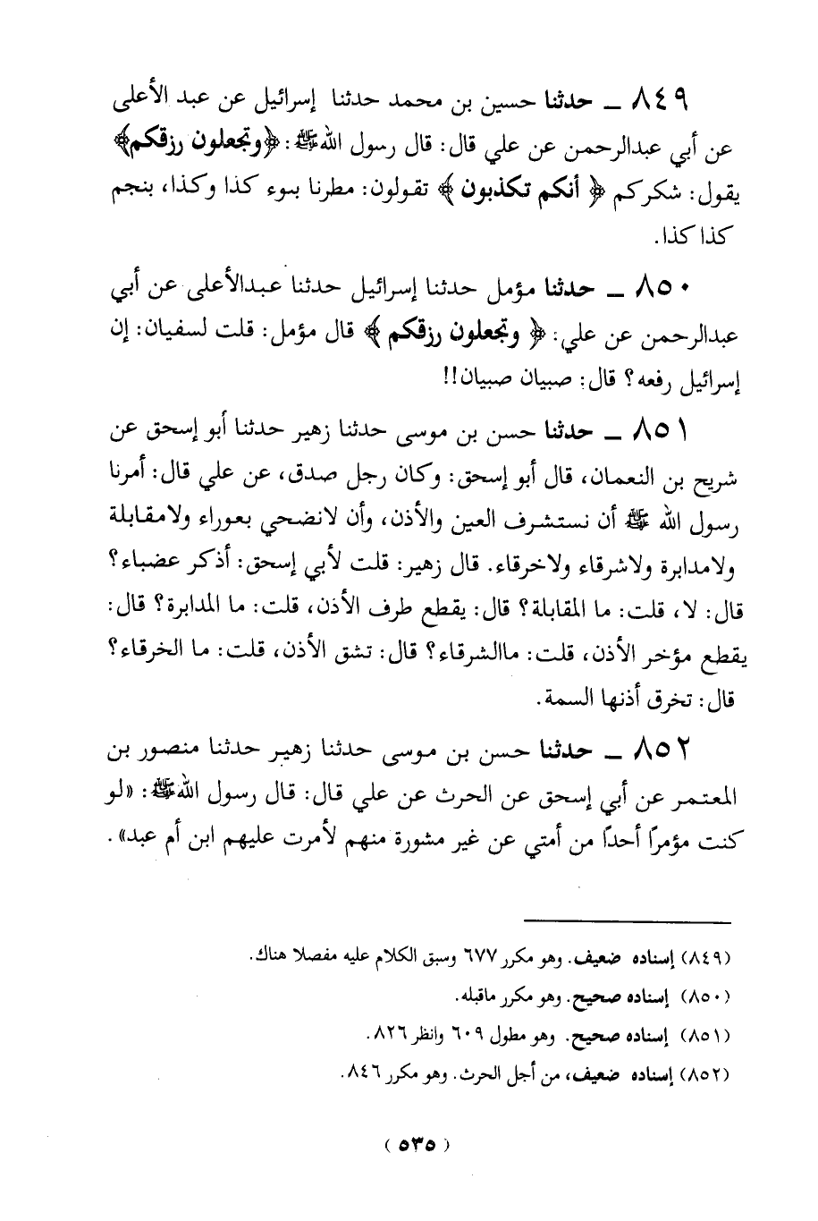 850 - حدثنا مؤمل حدثنا إسرائيل حدثنا عبد الأعلى عن أبي عبد الرحمن عن علي: {وَتَجْعَلُونَ رِزْقَكُمْ} قال مؤمل: قلت لسفيان: إن إسرائيل رفعه؟ قال: صبيان صبيان!!